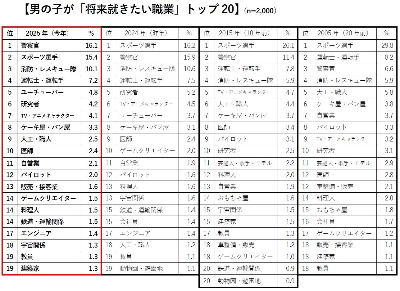 「警察官」が「スポーツ選手」を抜いて2年ぶりに1位に返り咲きました。20年前は「スポーツ選手」一強でしたが、近年は「消防・レスキュー隊」も加わり三強となっています。
