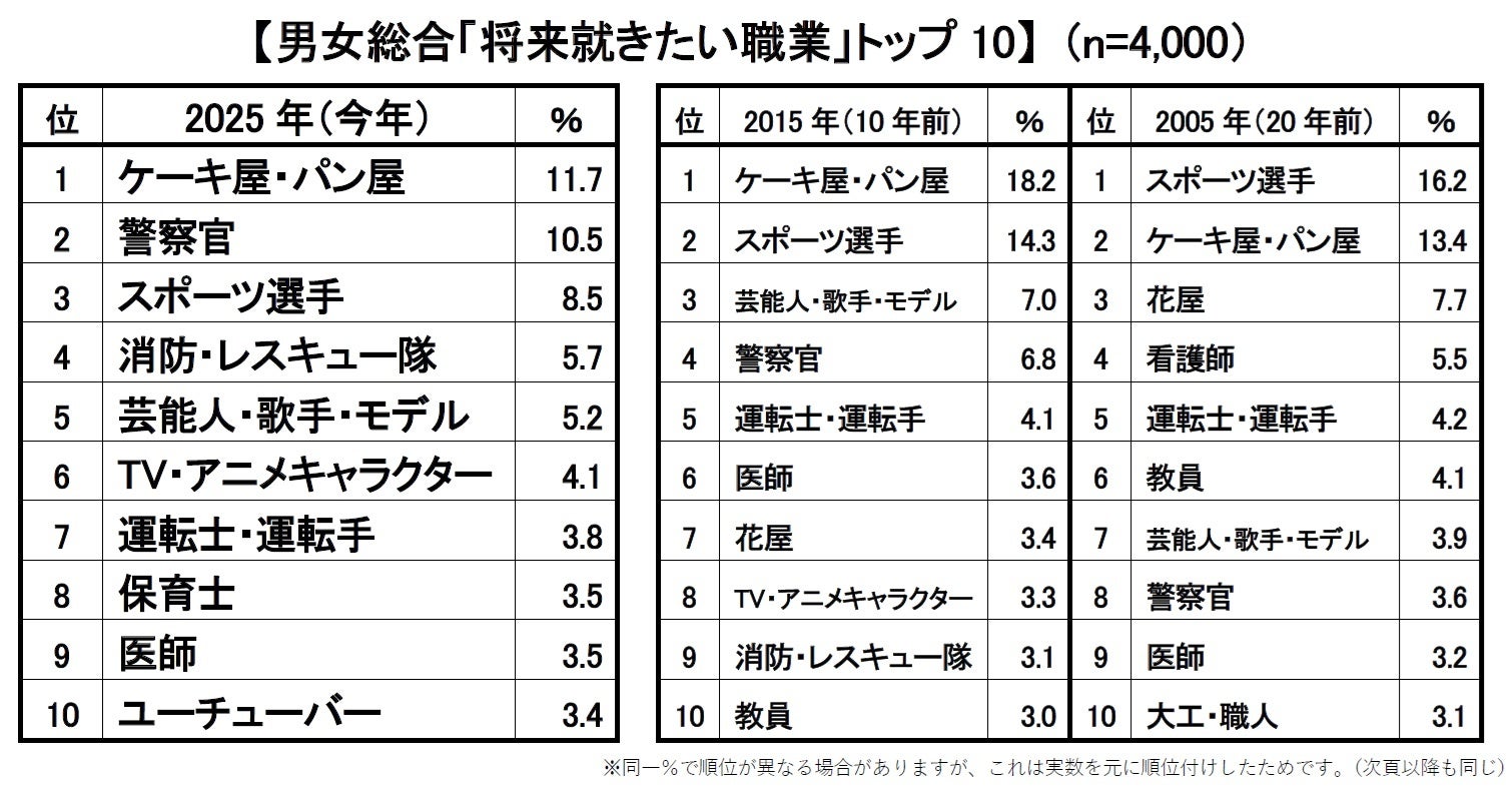 男女を合わせた総合順位のトップ3は、1位「ケーキ屋・パン屋」、2位「警察官」、3位「スポーツ選手」となりました。男の子に人気の「ユーチューバー」が、今年は女の子の票も集めて総合10位に入りました。10年前・20年前と比較すると、「警察官」「消防・レスキュー隊」への関心が高まっていることがうかがえました。