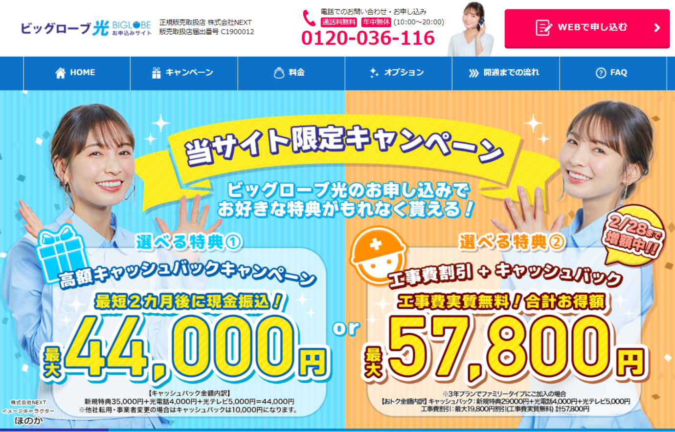 ビッグローブ光正規代理店 株式会社NEXT(以下、当社)は、ビッグローブ光をお申し込みいただいた方を対象に、2つの特典からお選びいただける「選べるキャンペーン」(以下、本キャンペーン)を実施中です。