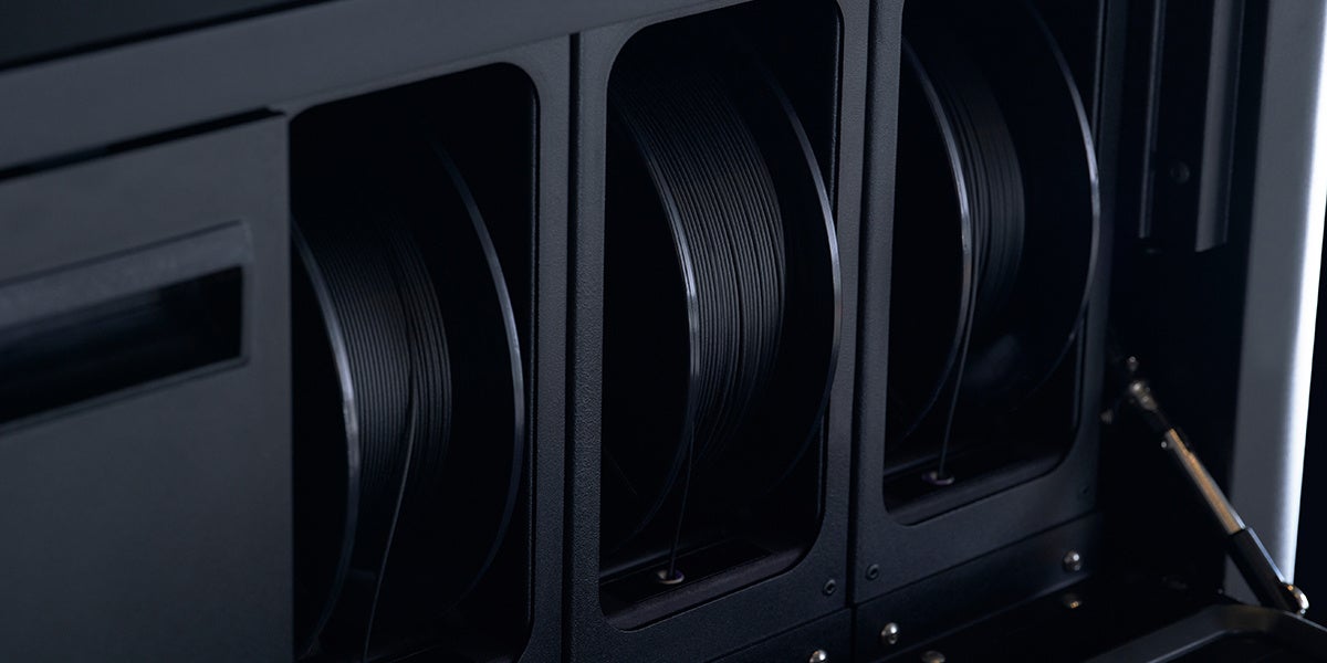プリンター内の材料格納庫には、個別に密封された格納庫に4つのスプールを収納でき、自動での材料交換と迅速なスプールのローディングをサポートし、ユーザーの負担を軽減します。