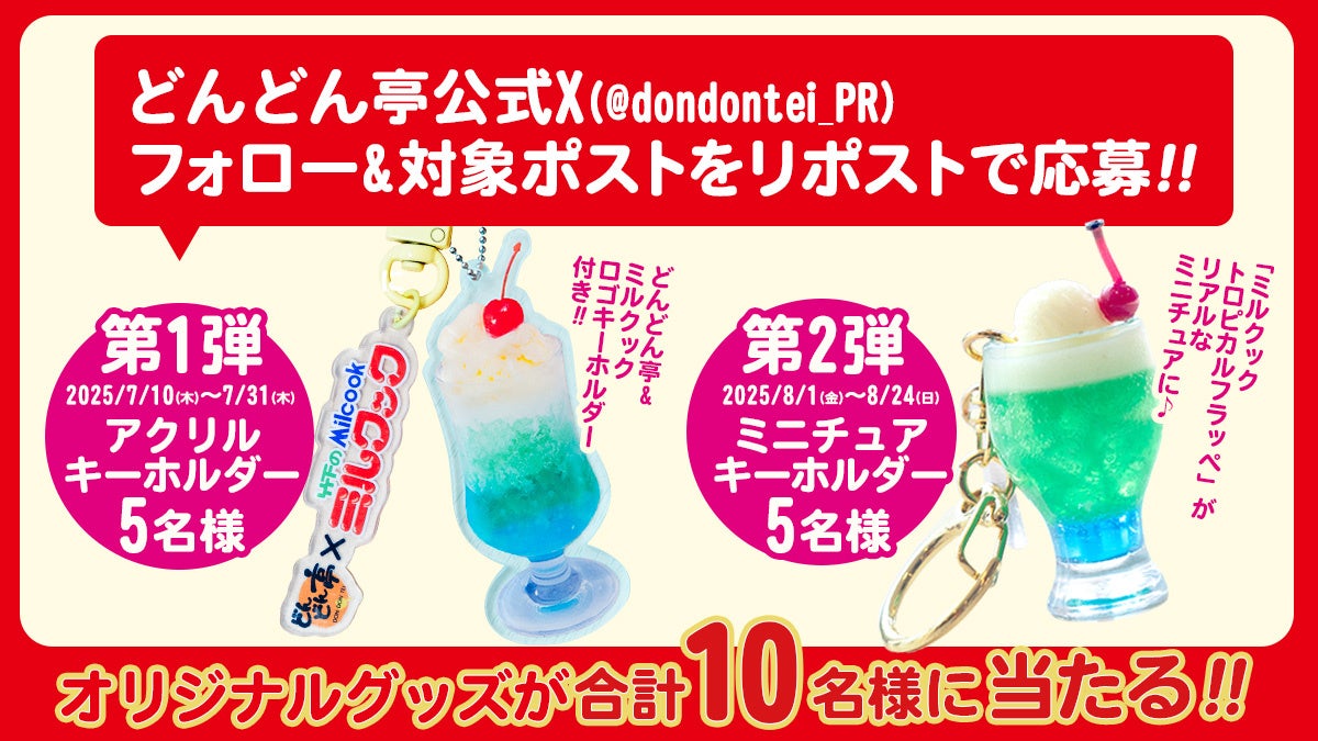 応募方法はとっても簡単!指定期間中に、公式アカウント(@dondontei_PR)をフォローのうえ、対象の投稿をリポストしていただいた方の中から抽選で各5名様にかわいい「ミルクック トロピカルフラッペ」キーホルダーをプレゼントいたします。