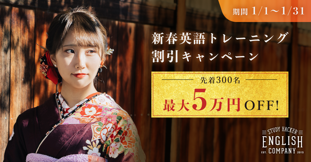 英語パーソナルジム「StudyHacker ENGLISH COMPANY」(https://englishcompany.jp/ )や自習型英語学習コーチングサービス「STRAIL(ストレイル)」(https://strail-english.jp/ )を運営する株式会社スタディーハッカー(本社:東京都渋谷区、代表取締役社⻑:岡健作)は、2022年1月1日から1月31日までに新規でENGLISH COMPANYの対象コースに入会された先着300名様を対象に、 受講料が最大5万円割引となる「新春英語トレーニング割引キャンペーン」を開始いたします。