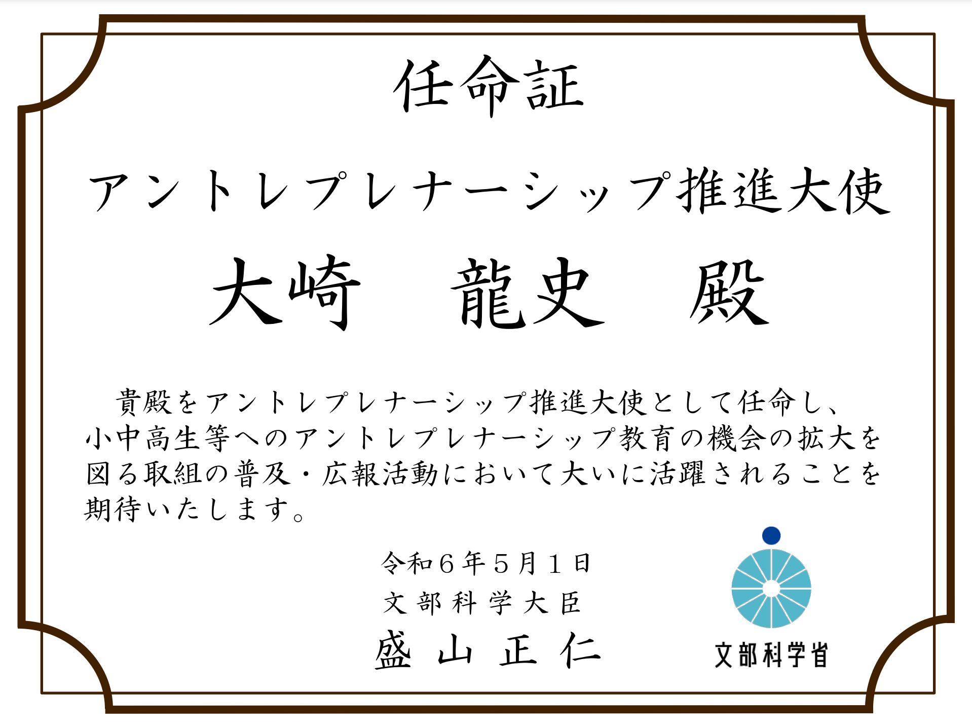 【国任命!!!】瀬戸内サニー株式会社代表の大崎が「文部科学省アントレプレナーシップ推進大使」に就任しました!起業家教育に取り組みたい教育機関や自治体、企業団体等を大募集!