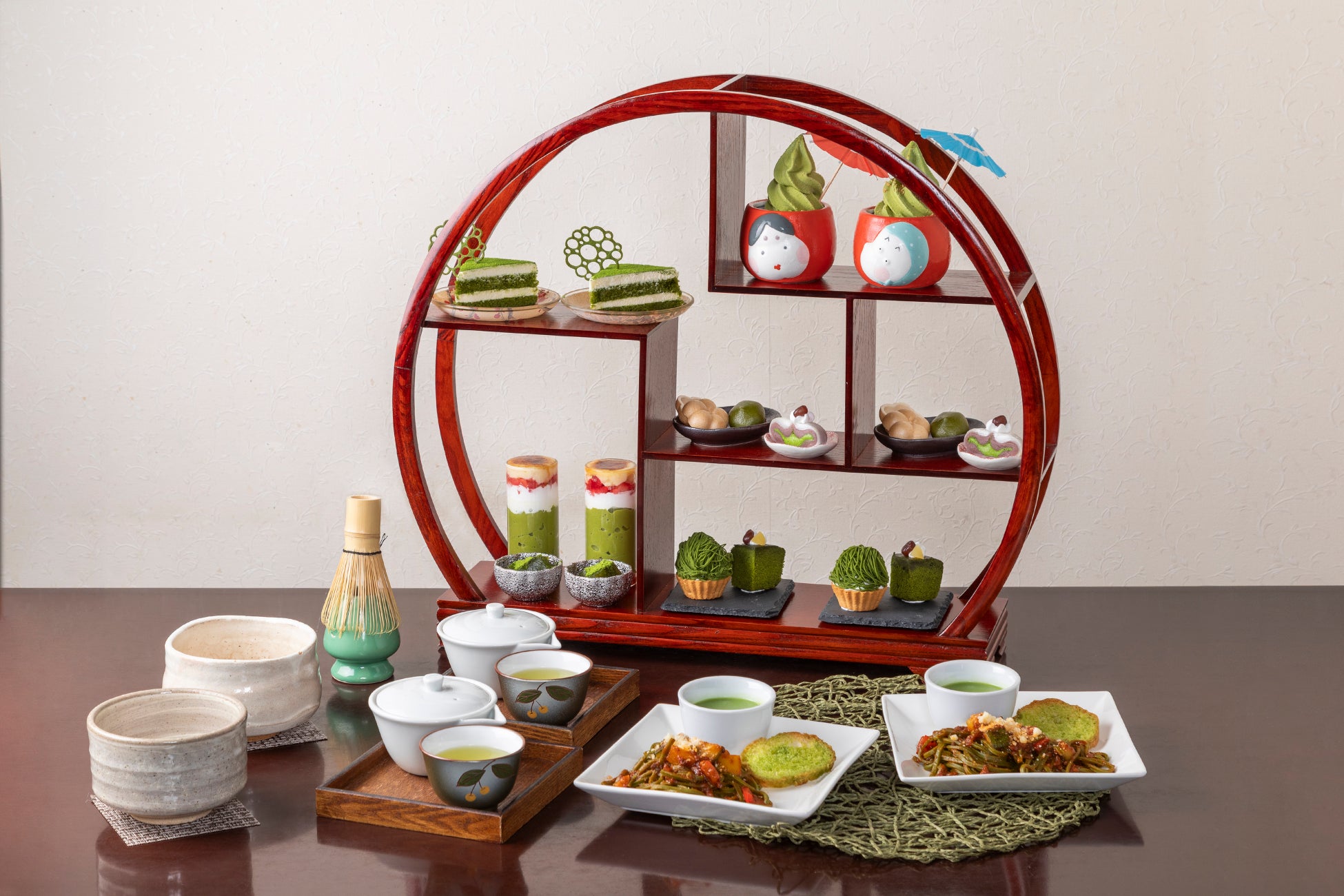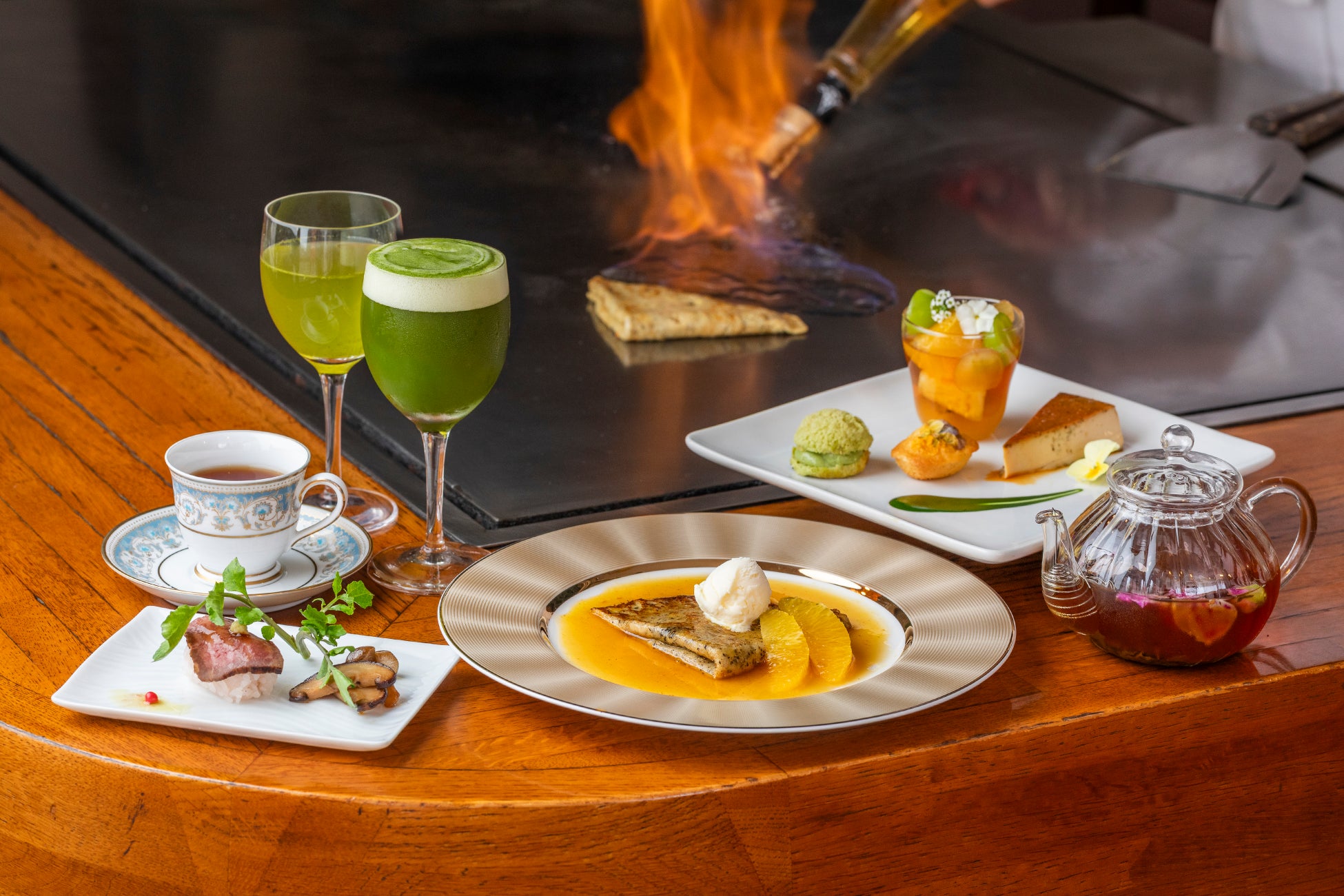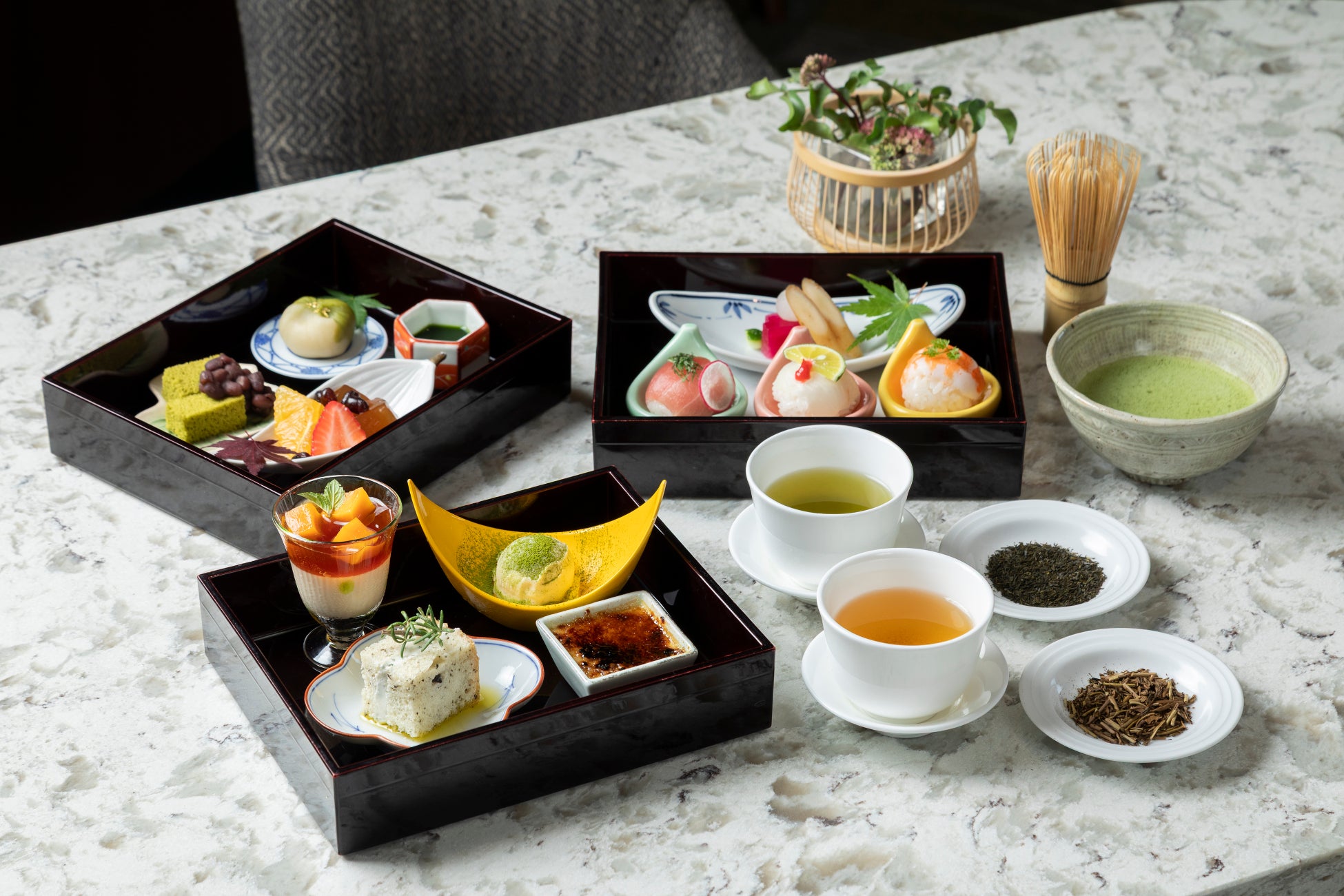 少し苦めのウェルカムお抹茶でお出迎え。しっとりとしたカステラの「浮島」静岡抹茶入りの「練り切り」洋食の「抹茶のクレームブリュレ」がマッチ。黄金色の香気あふれる味わいの本山の浅蒸し煎茶は、日本料理四季の料理長謹製「手毬寿司」がぴったり。洋の華やぎ、和の深み、ふたつの味わいを一度にお楽しみください。