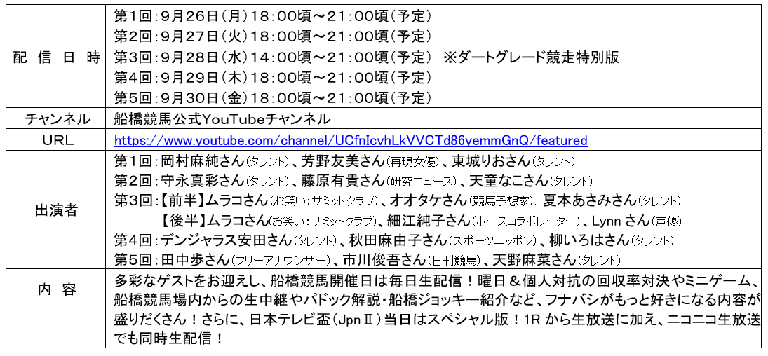 船橋競馬では、令和4年度第6回船橋競馬〔令和4年9月26日(月)〜30日(金)〕について、新型コロナウイルス感染拡大防止対策を講じた上で、滞留人数3,000人(うち特別観覧席166人)までの有観客開催となります。開催全日で、船橋ケイバ屋台、キッズスペースや場内イルミネーションなどファミリーでも楽しめるイベント等を予定しております。場内イベントのお知らせは、次頁以降に詳細を記載しておりますのでご覧ください。また、入場および施設の利用につきましては、「令和4年度第6回から第8回までの船橋競馬の入場について」をご確認ください。