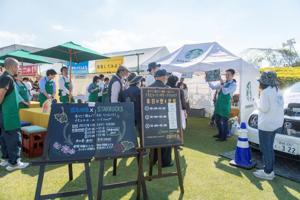 《霧島秋まつり2024で2社によるコラボレーションワークショップを実施!》 2024年11月2日、3日に開催予定の「霧島秋まつり2024」では、さつまいもとコーヒーの魅力が楽しめるワークショップを行います。霧島酒造のサツマイモ発電の電力を活用したコーヒーの抽出、さつまいもとコーヒーのフードペアリング体験など、約40分間の体験型ワークショップで、小さなお子様から大人の方までお楽しみいただけます。 その他、霧島酒造グリーンエネルギー部による環境教室、コラボレーション施設に関する特設ブースもご用意しています。 日程:2024年11月2日(土)、3日(日) 場所:「焼酎の里 霧島ファクトリーガーデン」 【霧島秋まつり2023の様子】 時間:10:30~/11:30~/14:00~/15:00~ ※当日予約制 2社によるコラボレーションワークショップへの参加は、当日の出店ブースにて予約を受け付けます。 詳しくは「焼酎の里 霧島ファクトリーガーデン」ウェブサイトをご覧ください。 |