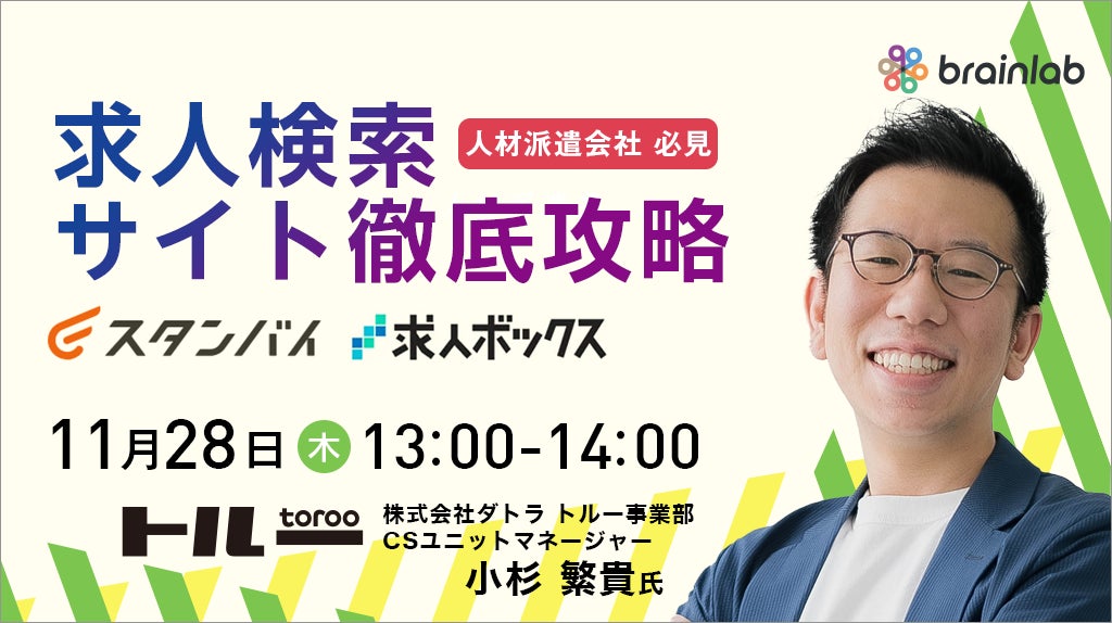 採用マーケティングサービス「トルー」を運営する株式会社ダトラ(本社:大阪市中央区、代表取締役:草深悠介)は2024年11月28日(木)、株式会社ブレイン・ラボ様との共催で無料オンラインセミナーを開催いたします。