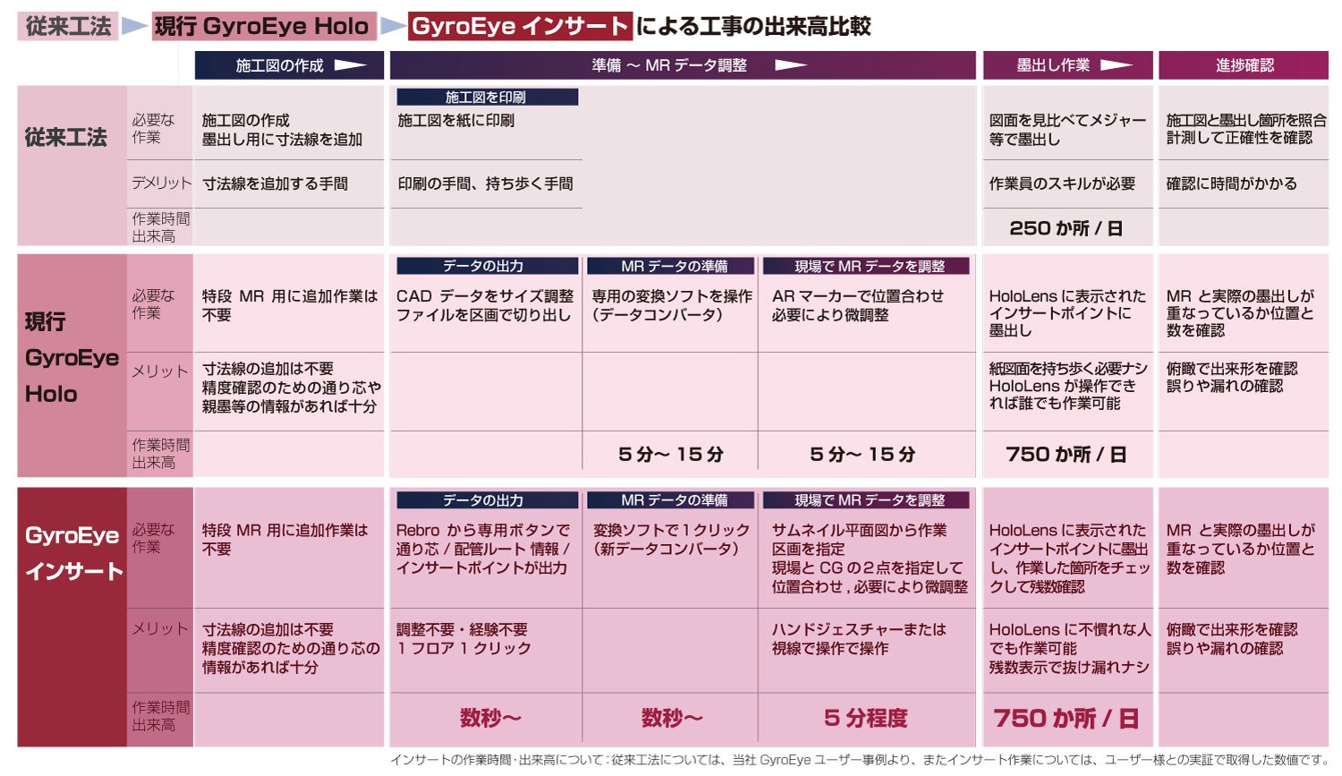 基本技術となるGyroEye(ジャイロアイ)は、Microsoft HoloLens 2に対応したMRアプリケーションと、データ変換ツール、コンテンツ管理システムで構成されるMRシステムです。建設業をはじめ製造業などで既に約150社で導入・活用が進んでいます。中でも設備インサートの墨出し業務では多くのユーザーから、従来の工法に比べて3~5倍の生産性・時間短縮が図れたと好評を得ています。