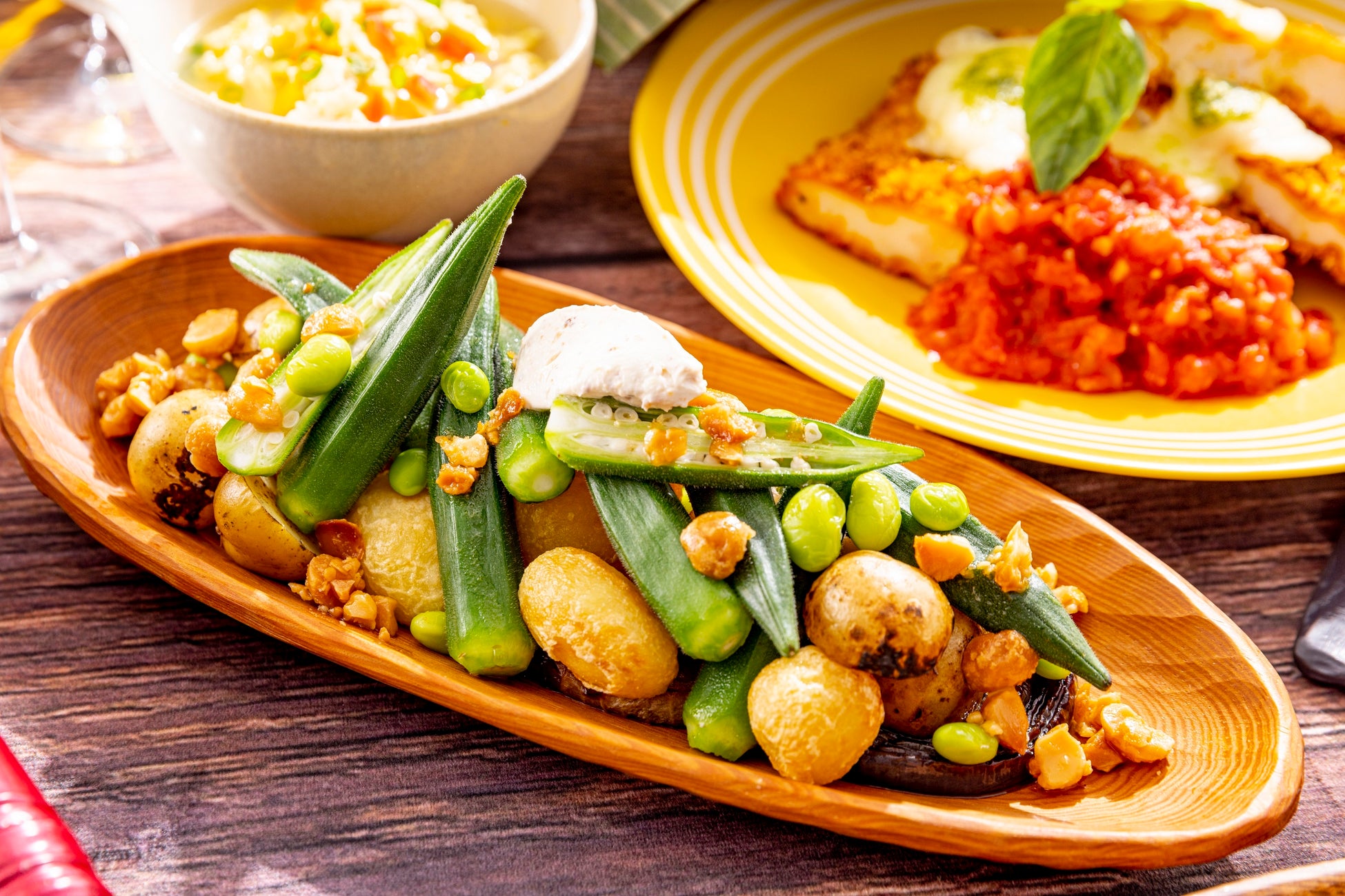 そして、毎回人気のカレーのコーナーはココナッツミルクにパイナップル等の甘みを加え、生姜、ニンニク、ターメリック等のスパイスと一緒に夏らしく仕上げた「タヒチ風カレーと日替わりライス」をご用意。オリジナルのピタサンドを作ることができるれる「ピタサンドステーション」では色とりどりのフムス、新鮮な野菜やドライグリーンカレーをお楽しみいただけます。