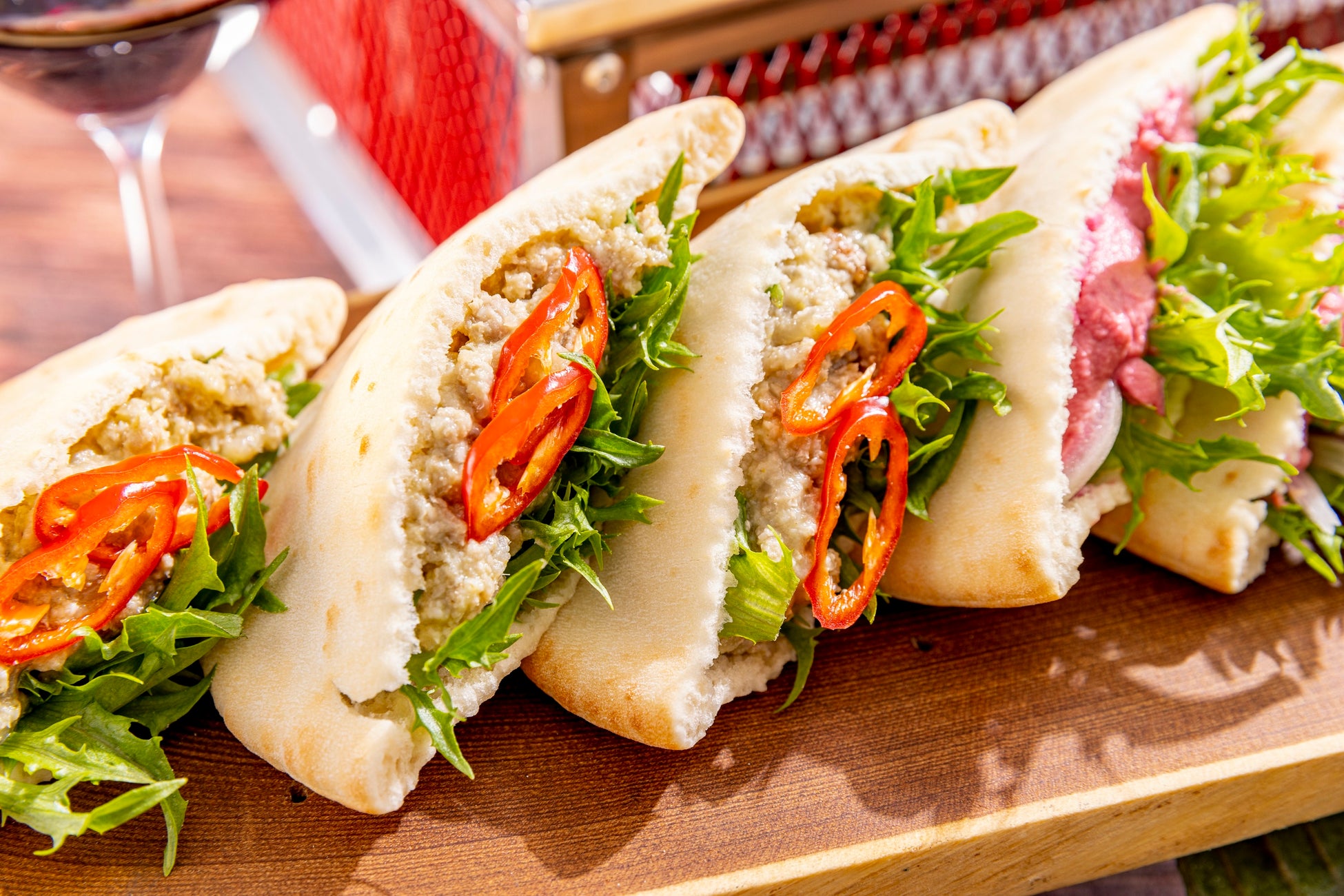もちもちなピタパンに色とりどりのフムス、新鮮な野菜やドライグリーンカレーをご用意。オリジナルピタサンドをお楽しみいただけます。