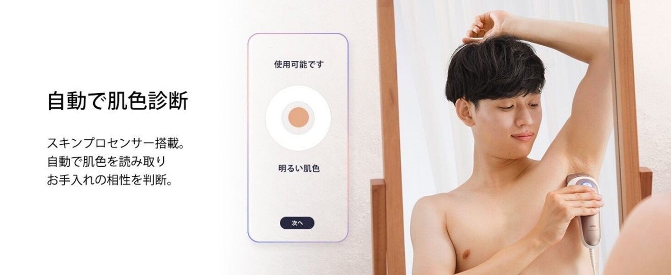 「ブラウン AIおうちサロン」は、肌の色を自動で診断し、あなたの肌とブラウンIPL方式とのお手入れの相性を教えてくれるため、初めて家でムダ毛ケアをされる方でも、安心してご使用いただけるように設計されています。主要サロンでも使用されているIPL方式は、暗い色に反応する光を用いてムダ毛ケアをする手法です。しかし肌にも暗い色が含まれているので、肌の色によって安全にご使用いただけないこともあります。実際にIPL方式を使用しているサロンでは、肌の色が暗い方や日焼けしている方はお手入れをお断りされることがあります。