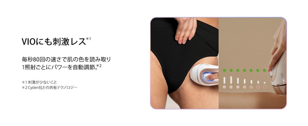 サロンでお手入れをしてもらうのが恥ずかしいなどの理由によりVIOの自宅でのお手入れニーズは高くなっています。しかしデリケートな部分だからこそ自分でお手入れしたときの安全性や刺激を不安に思われる方もいらっしゃいます。VIOは一般的に他の部位よりも肌の色が暗い傾向にあり、さらにVIOの中でも部位によって肌の色が異なることも。ブラウンはスキンプロセンサーを搭載し、毎秒80回の速さで肌の色を読み取り、1照射ごとにパワーを自動で調節します。