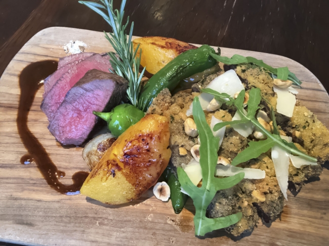 鹿のロース肉をシンプルにローストしたものと、猪のもも肉のカツレツを豪快に盛りつけました。シチリア風のカツレツとは、衣にチーズや香草などが入ったもので、口の中で香りが広がります。