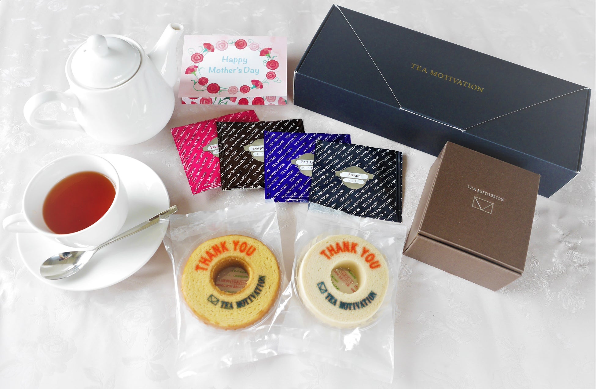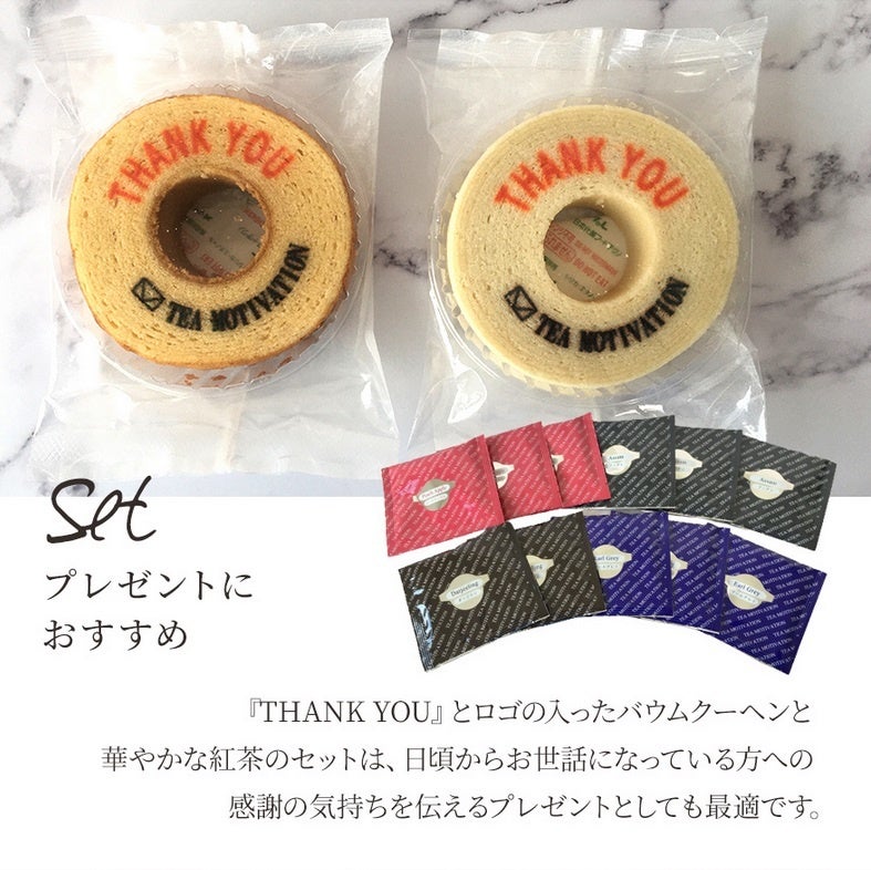 『THANK YOU』とロゴの入ったバウムクーヘンと華やかな紅茶のセットは母の日ギフトにはもちろん、日頃からお世話になっている方への感謝の気持ちを伝えるプレゼントとして最適です。