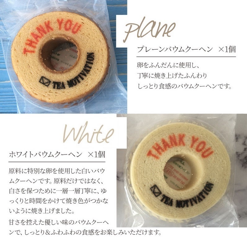 ◆商品仕様(ホワイトバウムクーヘン):●名称:半生菓子 ●原材料:バウムクーヘン 鶏卵(国産)、砂糖、小麦粉、マーガリン、コンスターチ、ショートニング、コンスターチ、水飴、牛乳、洋酒、食塩/乳化剤、膨張剤、香料、酸化防止剤(V、E)、着色料(カロテン、カラメル、青1、黄4、赤102、赤106)、(一部に小麦・卵・乳成分・大豆を含む)◆商品仕様(紅茶):ナイロンメッシュ三角ティーバッグ(タグ付き)茶葉2.5g (アールグレイ、ピーチアップル) 3g(ダージリン、アッサム) ×4種11ティーバッグ(個包装) 賞味期限:各個包装に記載