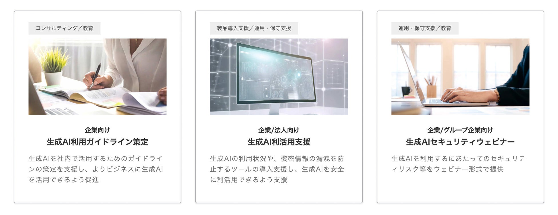 このような背景から当社は、ギブリーと法人向け生成AI活用プラットフォーム「法人GAI」における販売代理店契約を締結し、生成AIの活用支援から運用までをトータルサポートする「生成AIセキュリティリスクマネジメント支援」(以下、本サービス)の提供を開始しました。