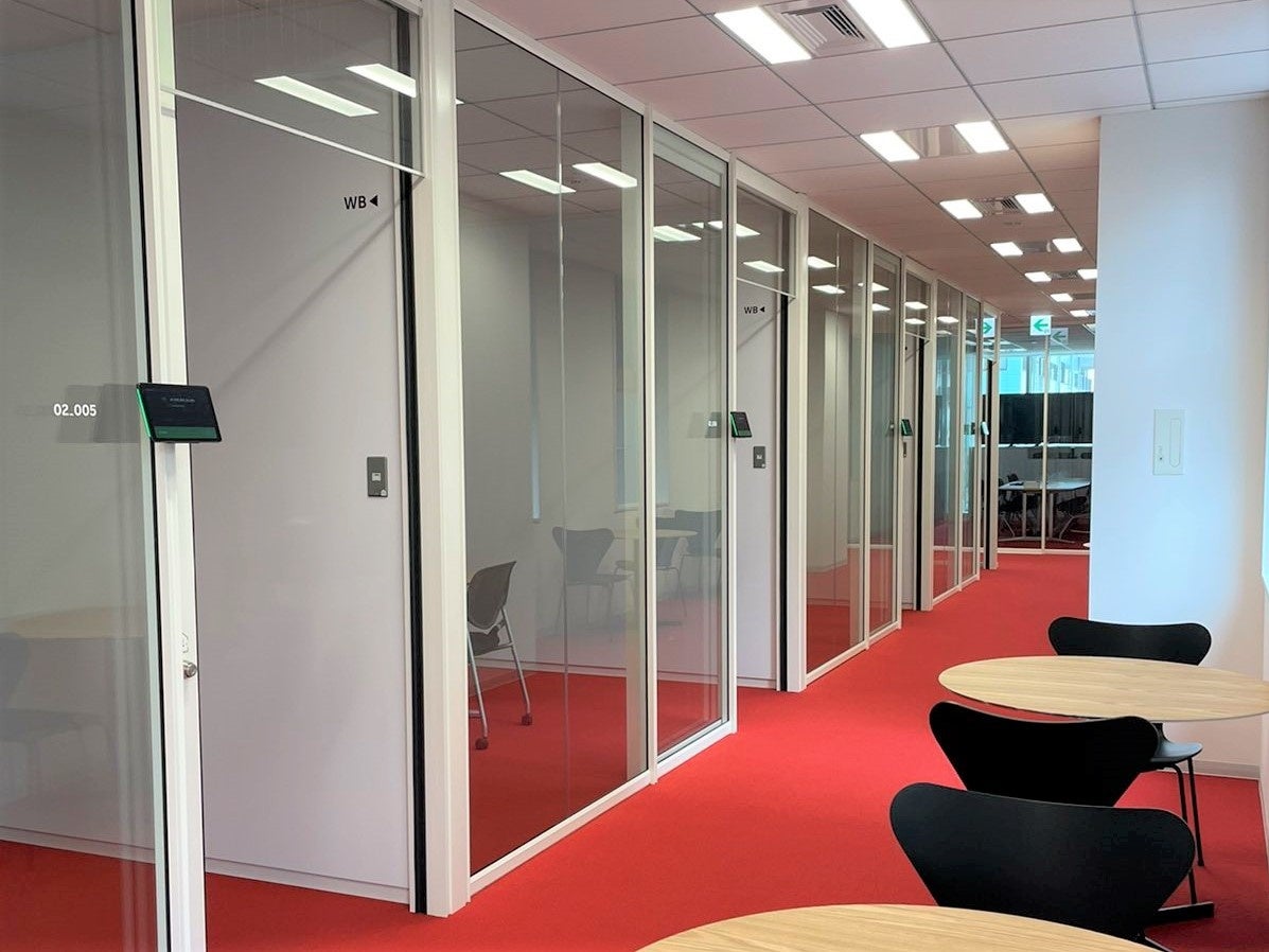 2021年11月に竣工した新しいオフィスの「福岡第1支社」には、1,000席以上の執務スペースがあり、新型コロナウイルス感染予防対策のため、各フロアの扉に自動ドアを採用しました。また、Study Lounge(読書室)やウェブ会議に適した専用ブース席などのエリアも設けています。