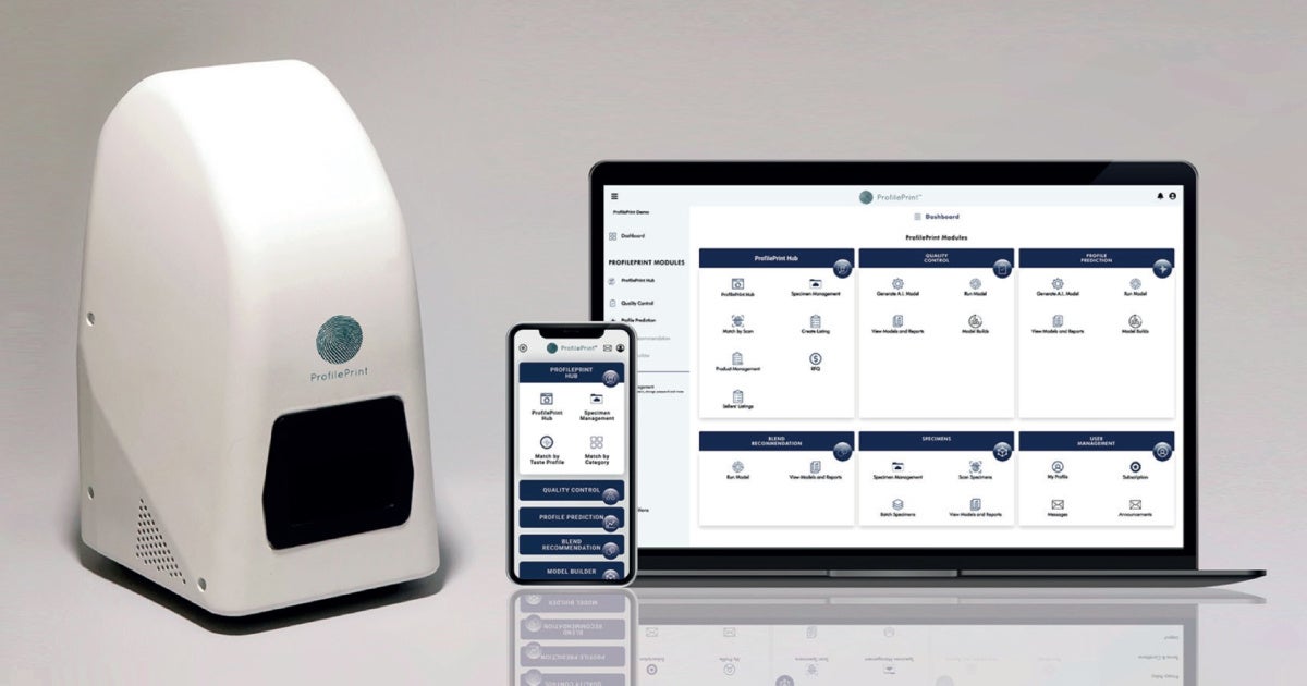 従来のガスクロマトグラフィーやスペクトロメーターなどの高度化学分析装置は、精度の高い測定ができる反面、時間やコストがかかり、現場導入が十分に進んでいませんでした。そこでProfilePrintは、幅広いスペクトルを照射するポータブルデバイスを開発し、非破壊でバイヤーの求める食品素材の特徴を認識する独自AIを構築してきました。茶葉・コーヒー・カカオ・ハーブ・スパイスなどの素材データを蓄積することによって、各バイヤーの必要要件を満たす機械学習モデルを構築しており、短時間でのレコメンド・マッチングを可能としています。