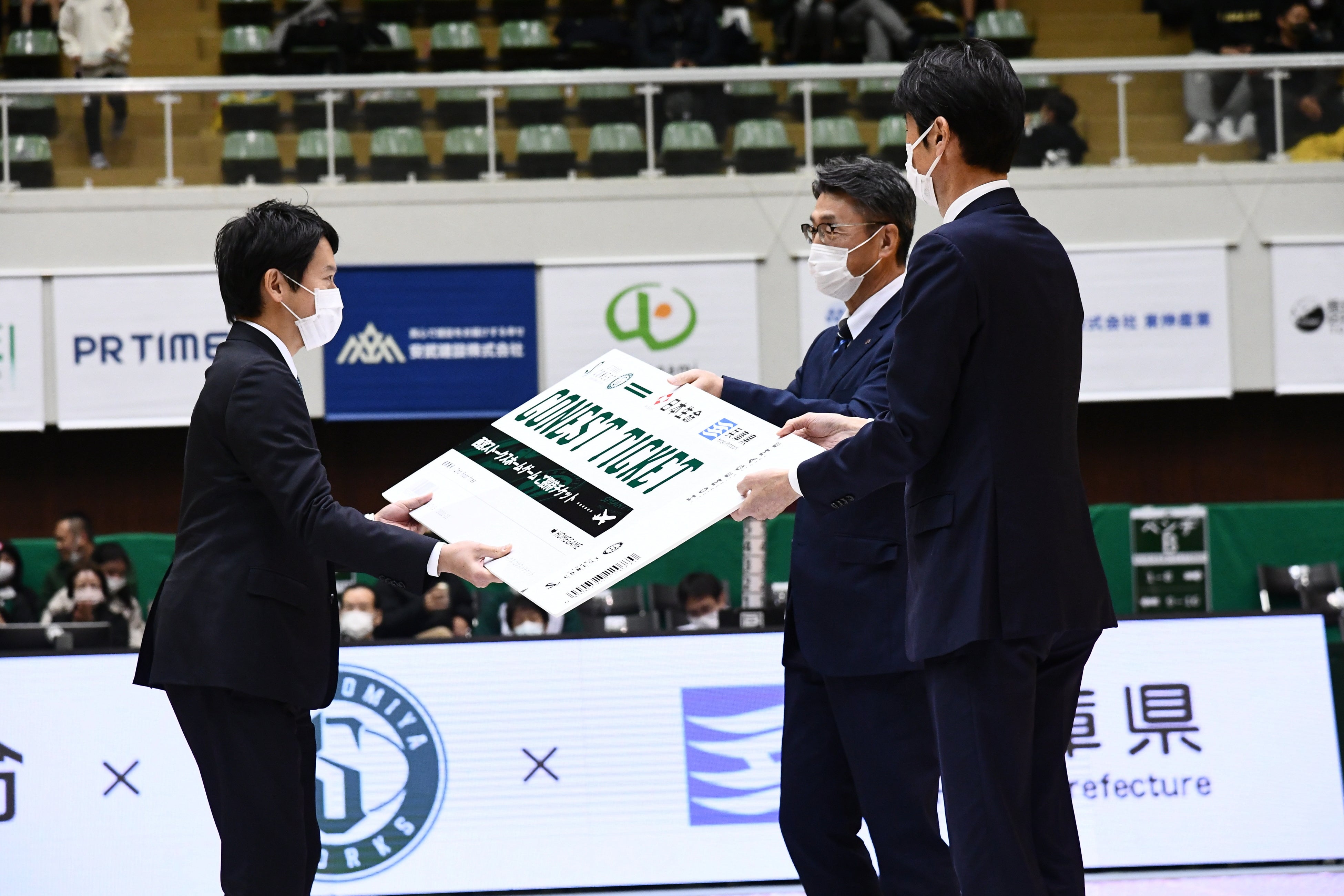 また、本プロジェクトに先立ち、兵庫県、日本生命保険相互会社、西宮ストークスの三者によるチケット贈呈式を開催しました。