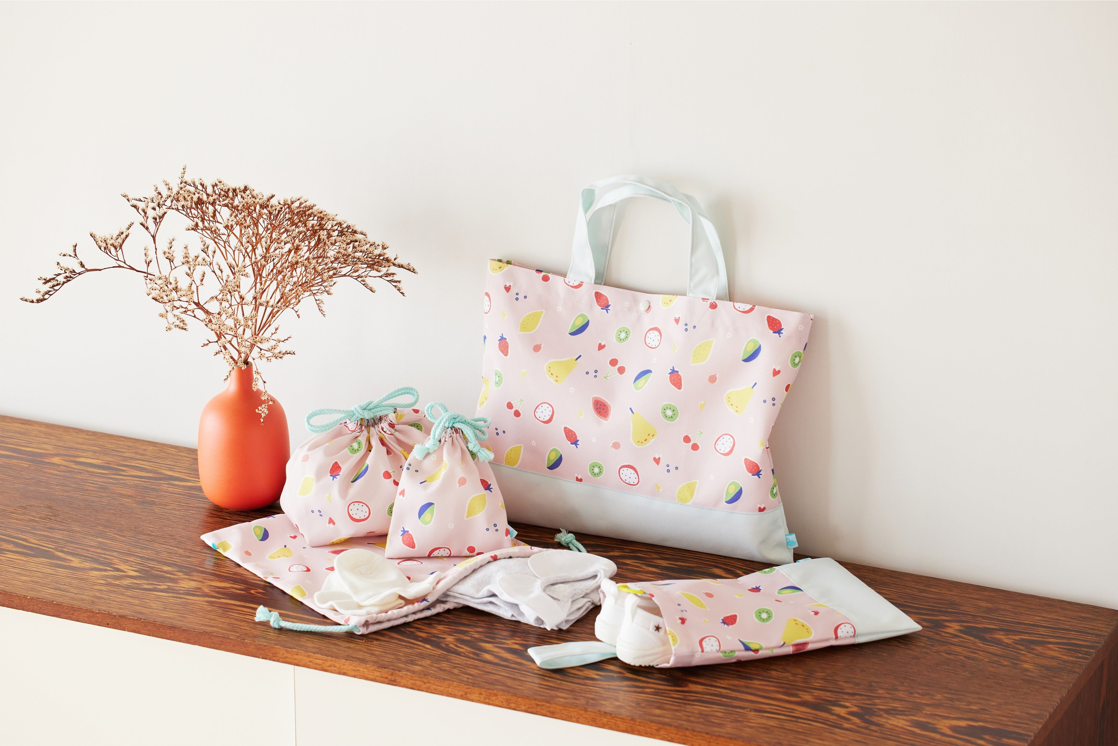大サイズにはお着替え、マチ付きの中サイズにはお弁当やお食事アイテム、小サイズにはコップと、通園に必要なものを整理できます。3サイズとも内側にネームタグ付きです。