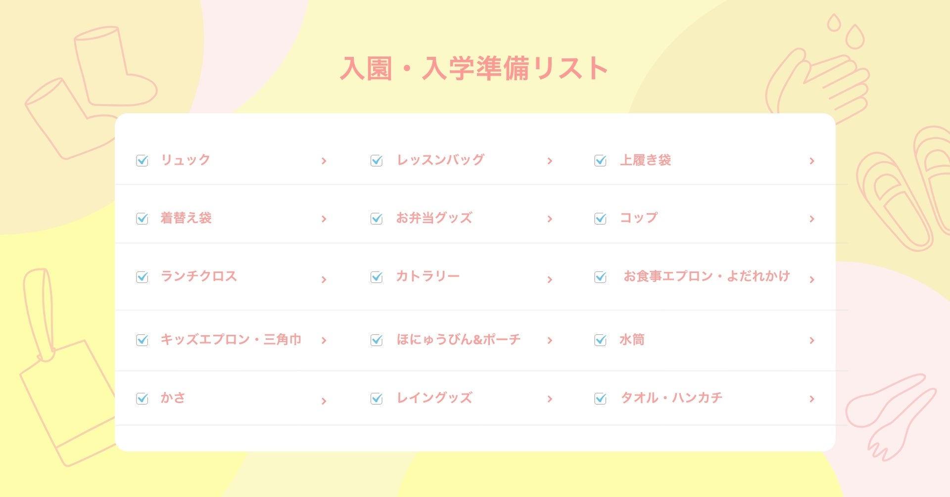 慌ただしい入園・入学準備。直前になると、ほしい商品、色や柄が売り切れていたり、お名前付けの時間がなくなってしまうことも。準備万端で入学・入園式を迎えるために早めの準備を!買い忘れ防止に必要なものリストを活用いただけます。