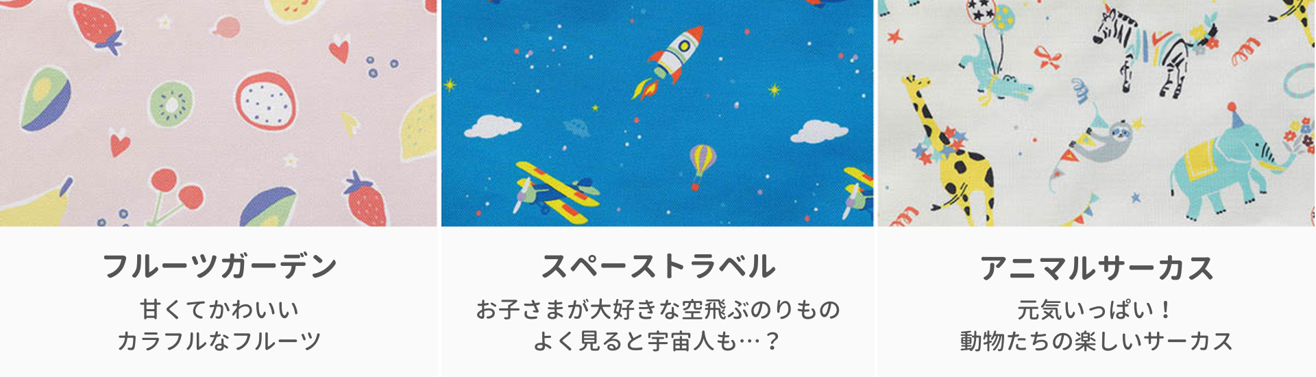 子どもたちの好きなもの、好きなカラーを取り入れた、フルーツガーデン、スペーストラベル、アニマルサーカスの3柄展開。好みが出てくる年齢のお子さまが愛着を持って使える、少しポップなデザインに仕上げました。