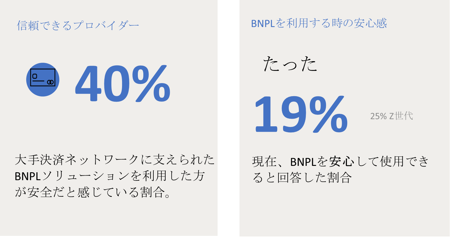 日本では、57%の消費者がBNPLについて少なくとも少し知っていると回答しているが、現在、安心して使用できると回答したのは19%にとどまります。一方、APAC消費者の50%は、現在安心して使っています。BNPLを使う場面として、日本の消費者の76%は、大口購入や緊急時の買い物に利用する可能性が高いと回答しています。また、40%は、大手決済ネットワークに支えられたBNPLソリューションの方がより安心できると感じています。
