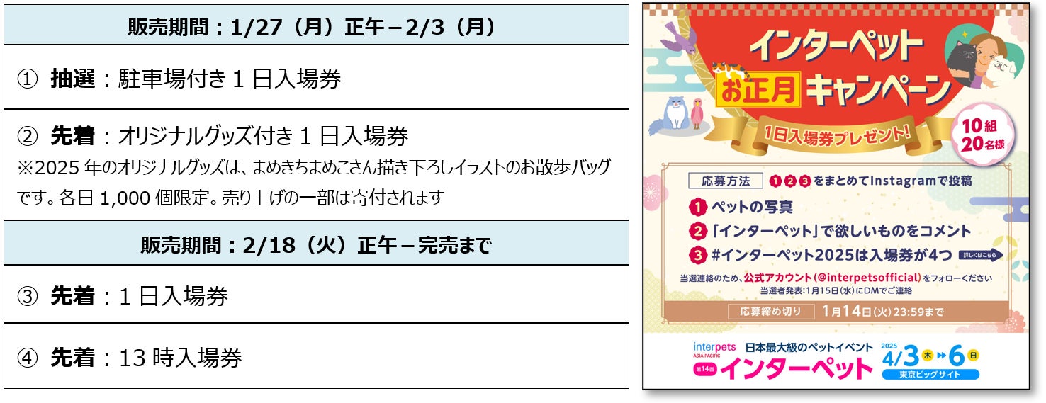 「インターペット」では入場券販売に先駆け、公式インスタグラムにて「インターペットお正月キャンペーン」を実施中です。(1)ペットの写真、(2)「インターペット」で欲しいもの、(3)ハッシュタグ「#インターペット2025は入場券が4つ」をまとめて投稿すると、抽選で10組20名様に1日入場券が当たります。応募受付は1月14日(火)まで。なお、入場券の購入に関する詳細は1月15日(水)から特設サイトで公開予定です。