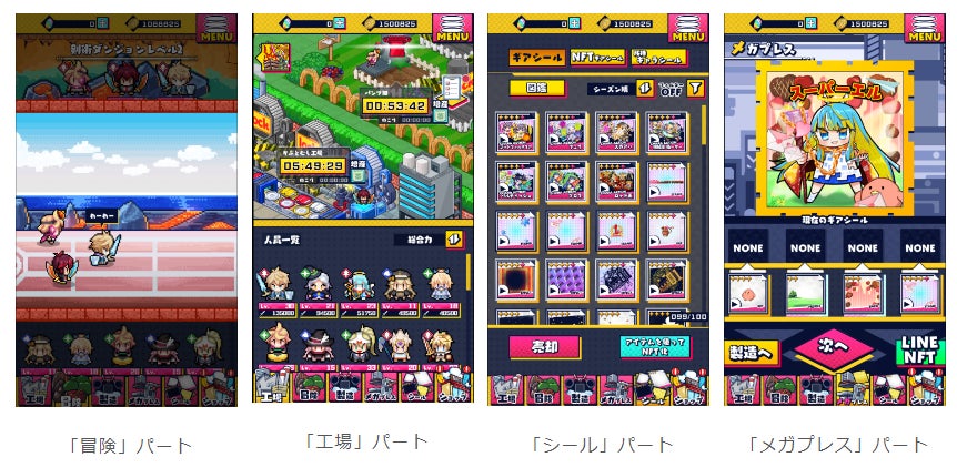 ゲームコンテンツには、「冒険」「工場」「製造」「シール」「メガプレス」という5つのパートがあります。