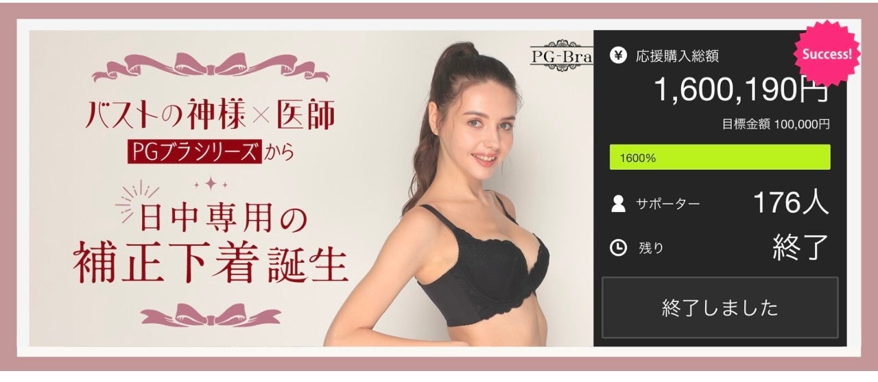 2024年4月1日(月)~4月29日(月)の期間中に実施したクラウドファンディングMakuakeでは 予想を大きく上回る目標達成率1600%、延べ176名のサポーター様よりご支援いただきました。一部のサイズではすでに売り切れとなり発売前からの注目度の高さがうかがえる結果となりました。より多くの方にPGブラDAYをお使いいただきたくオンラインでの一般販売を開始いたします。