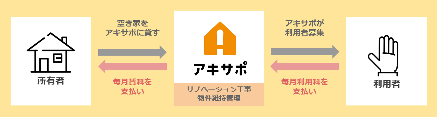 空き家を「アキサポ」が借り受け、「アキサポ」全額費用負担でリノベーション工事を行い、一定期間転借するサービスです。地域にマッチした空き家活用を提案することで街の資源である空き家の再生を通じて地域コミュニティの活性化に貢献しております。また、「アキサポ」は全国の空き家問題を解決するべく、全国各地の不動産会社や工務店などの空き家活用事業者とライセンス契約を結び、アキサポネットを形成し提携しております。