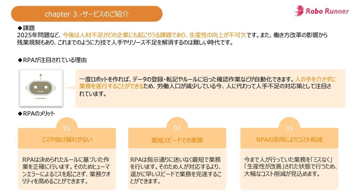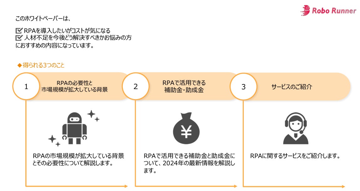 約1,000名のRPAエンジニア・コンサルタントが登録する「RPAプロフェッショナル」、RPA導入後の伴走型支援サービス「Robo Runner(ロボランナー)」等、RPA領域で包括的にサービスを展開するPeaceful Morning株式会社(本社:東京都渋谷区、代表取締役:田中 雄太 以下「当社」)は、2024年最新版のRPAに活用できる補助金や助成金をまとめたガイドブックを公開します。このガイドブックは、無料ダウンロードが可能です。