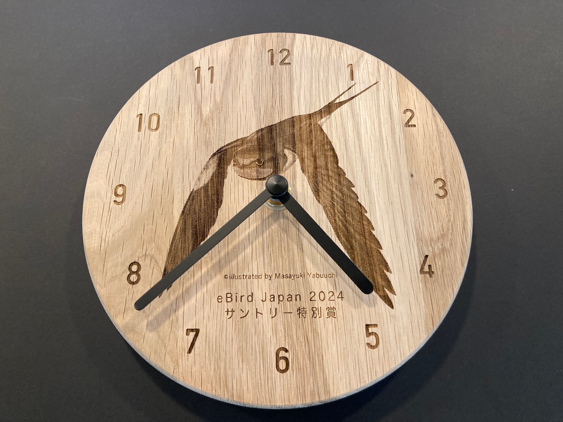 期間中にチェックリストを投稿された方のうち、観察対象種(夏鳥3種:ツバメ、キビタキ、オオヨシキリ)すべてを見た方10人(該当者多数の場合は抽選)に、サントリーホールディングス株式会社提供の「育林材のオリジナル時計(ツバメのデザイン)」をさしあげます。