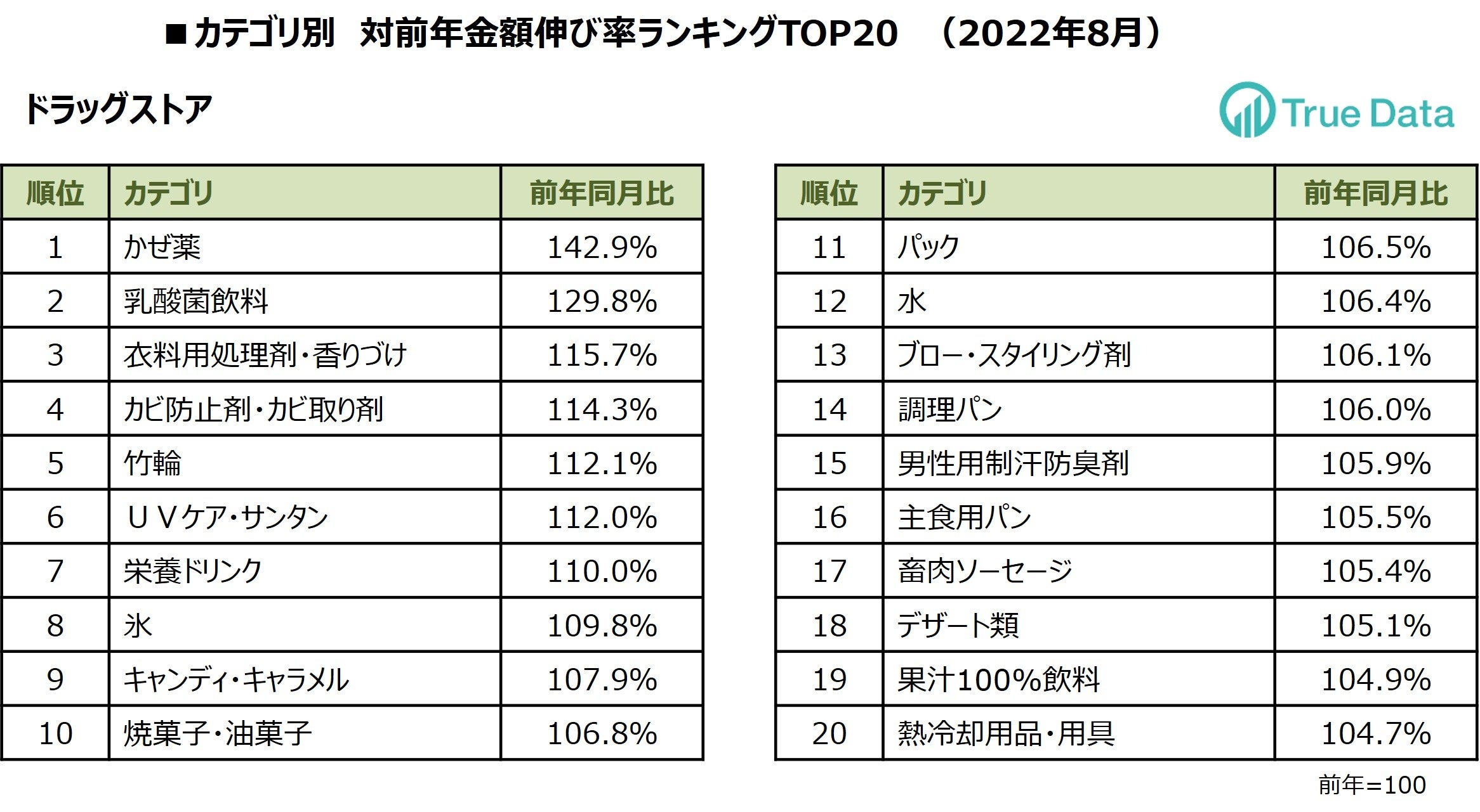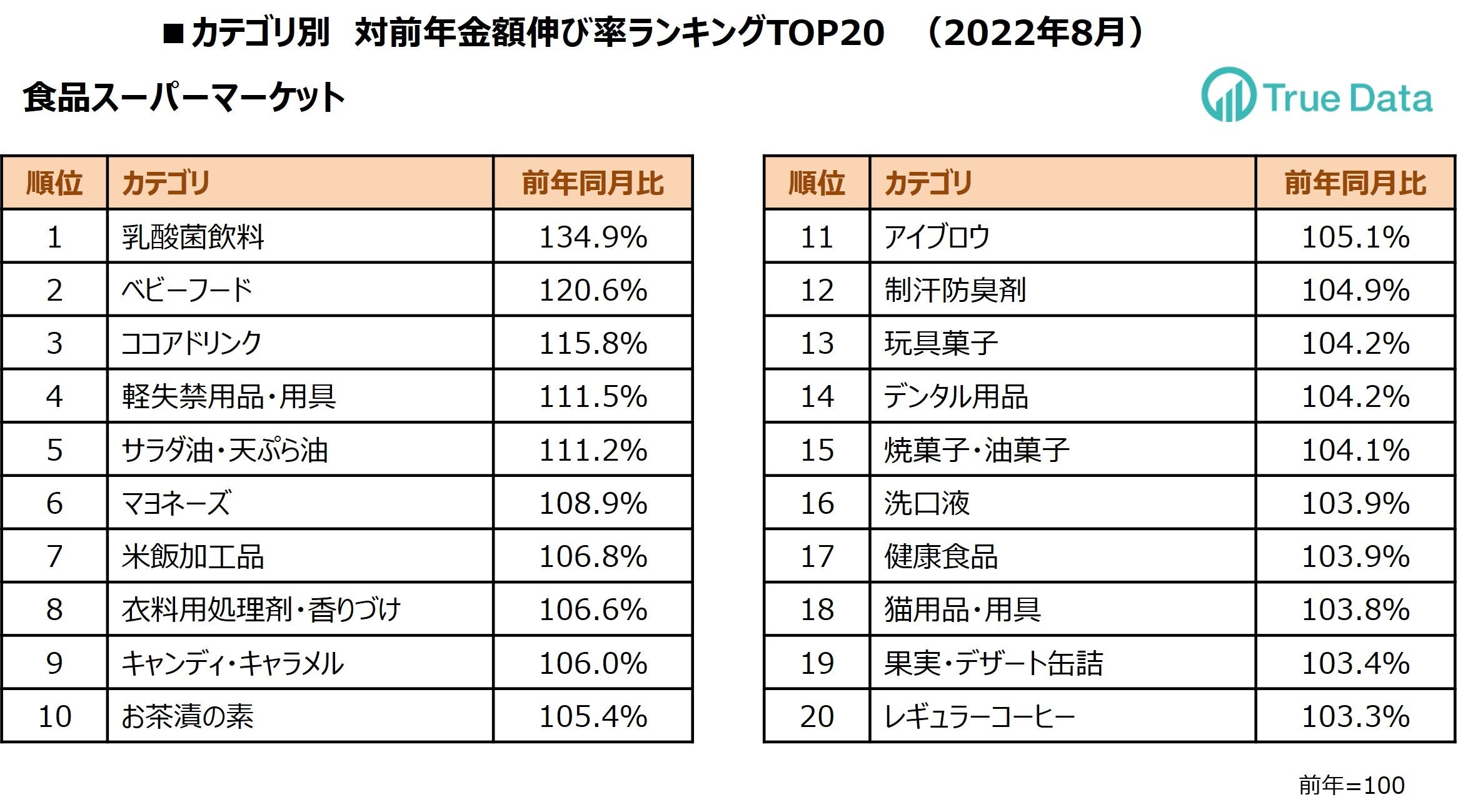 ~ドラッグストア、食品スーパーマーケット 2022年8月の対前年伸び率TOP20カテゴリを発表 ~