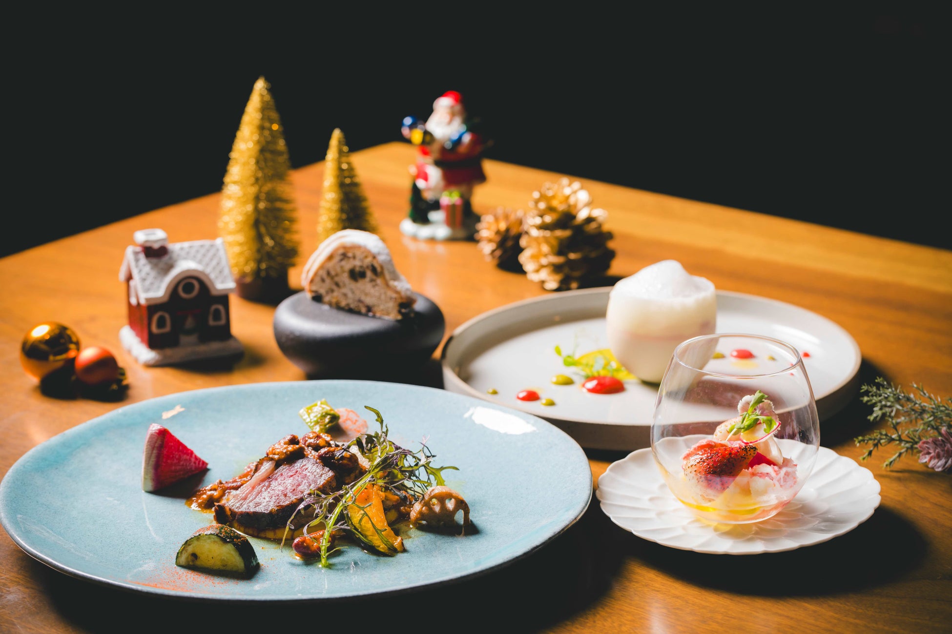 ディナータイムには、フェスティブシーズンにふさわしい特別コースが登場。4種類の前菜に続いて、メインに「骨付きショートリブのグリル オレンジ風味」をご用意しました。「和牛フィレ肉とオマール海老のサーフアンドターフ(+\5,000)」にも変更可能です。その後、繊細なノエルコースデザートとクリスマスには欠かせないシュトーレンをご提供します。華やかで豪華なお料理と共にご家族やご友人など大切な方々と過ごすスペシャルな時間をお楽しみください。