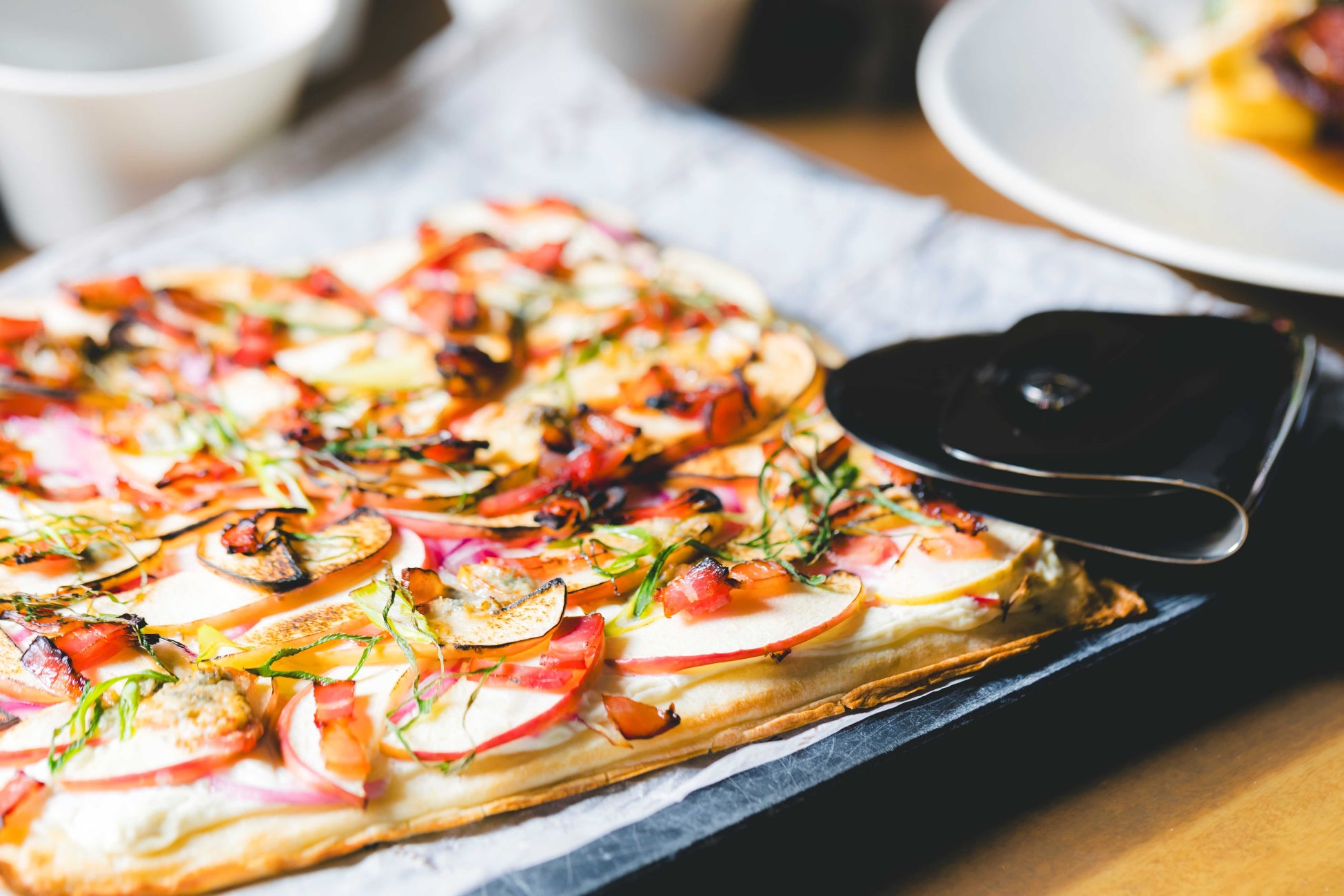 タルトフランベはアルザスの郷土料理。パン生地にフロマージュブランを塗り、玉ねぎベーコンを乗せたフレンチピザを紅玉りんごと九条葱でクリスマスカラーにアレンジしました。