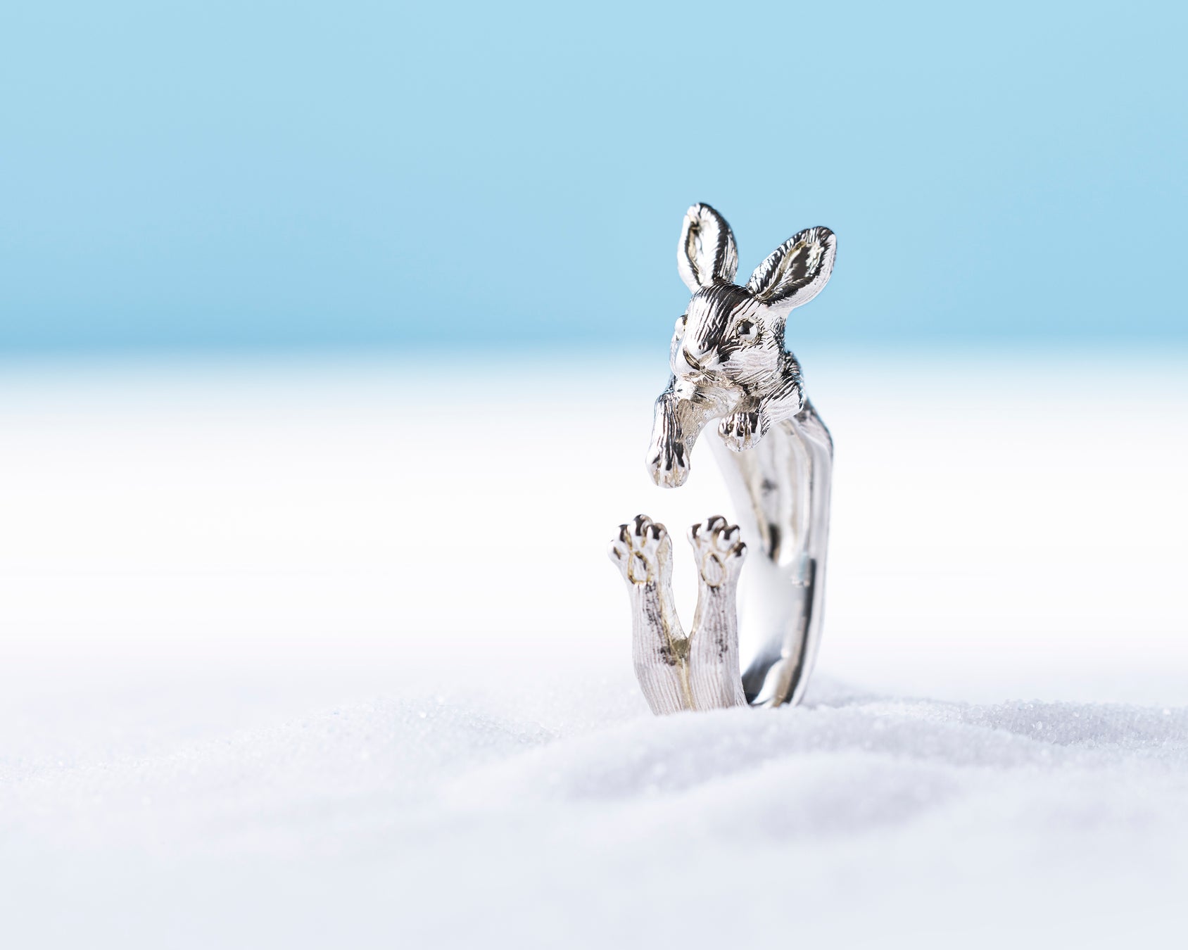 エゾユキウサギは、やわらかい新雪の上でも駆け回ることができるように、かんじきのような大きな足が特徴的で、毛並みまでリアルに表現しました。