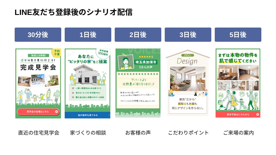 横尾材木店のWebサイトを訪問したユーザーに対して、サイト離脱前にポップアップでLINEの友だち追加を訴求し、追客をおこなう施策を実施しました。その後、LINEの友だち追加後1週間にわたってシナリオ配信で家づくりのポイントや、横尾材木店の特徴に関する内容を配信で案内しています。