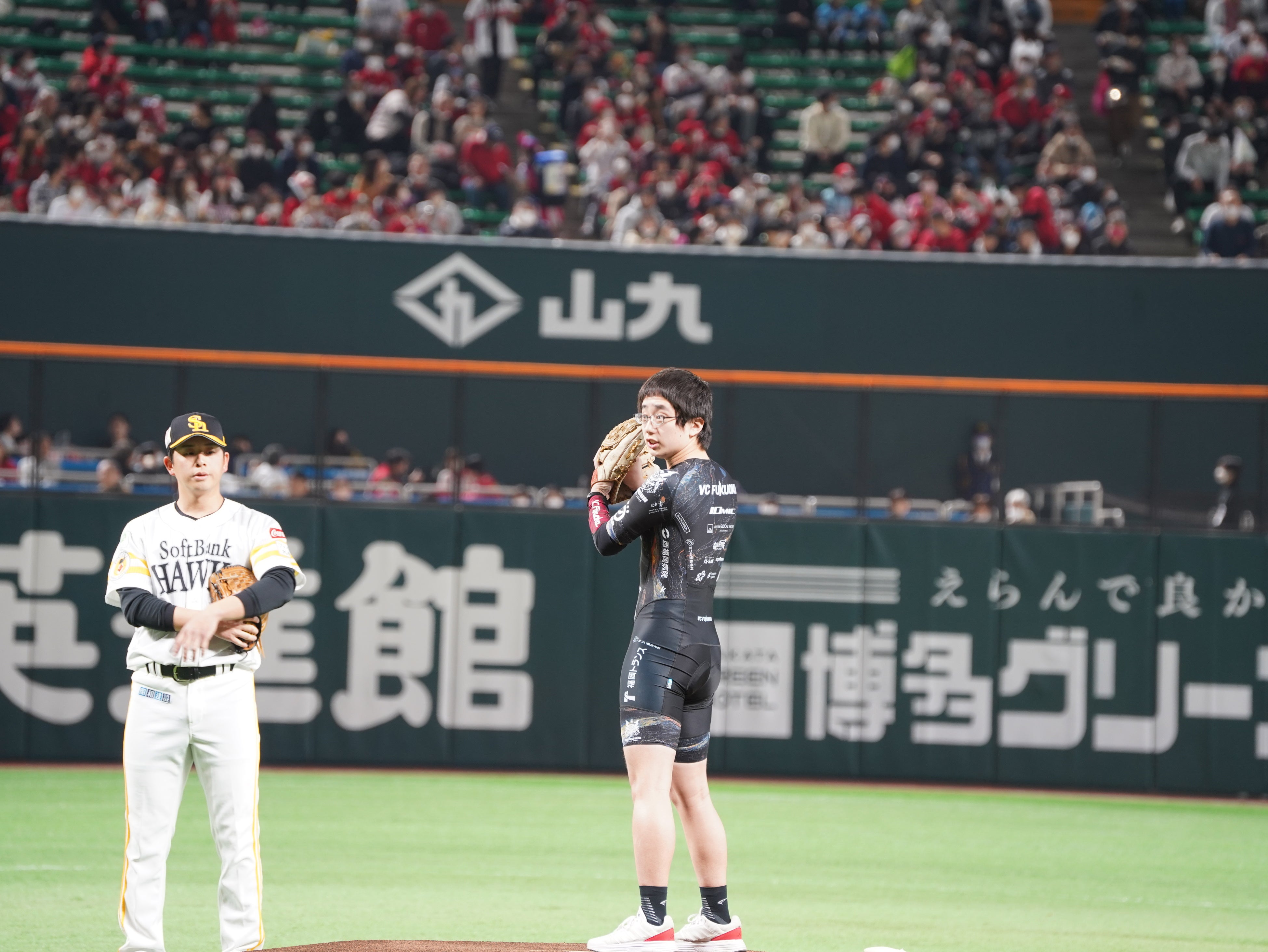 始球式は、VC FUKUOKA所属選手の知的障がい者でありながら自転車競技に打ち込み、昨年国際大会で優勝した実績をもつ大谷春樹がその機会を頂いた。