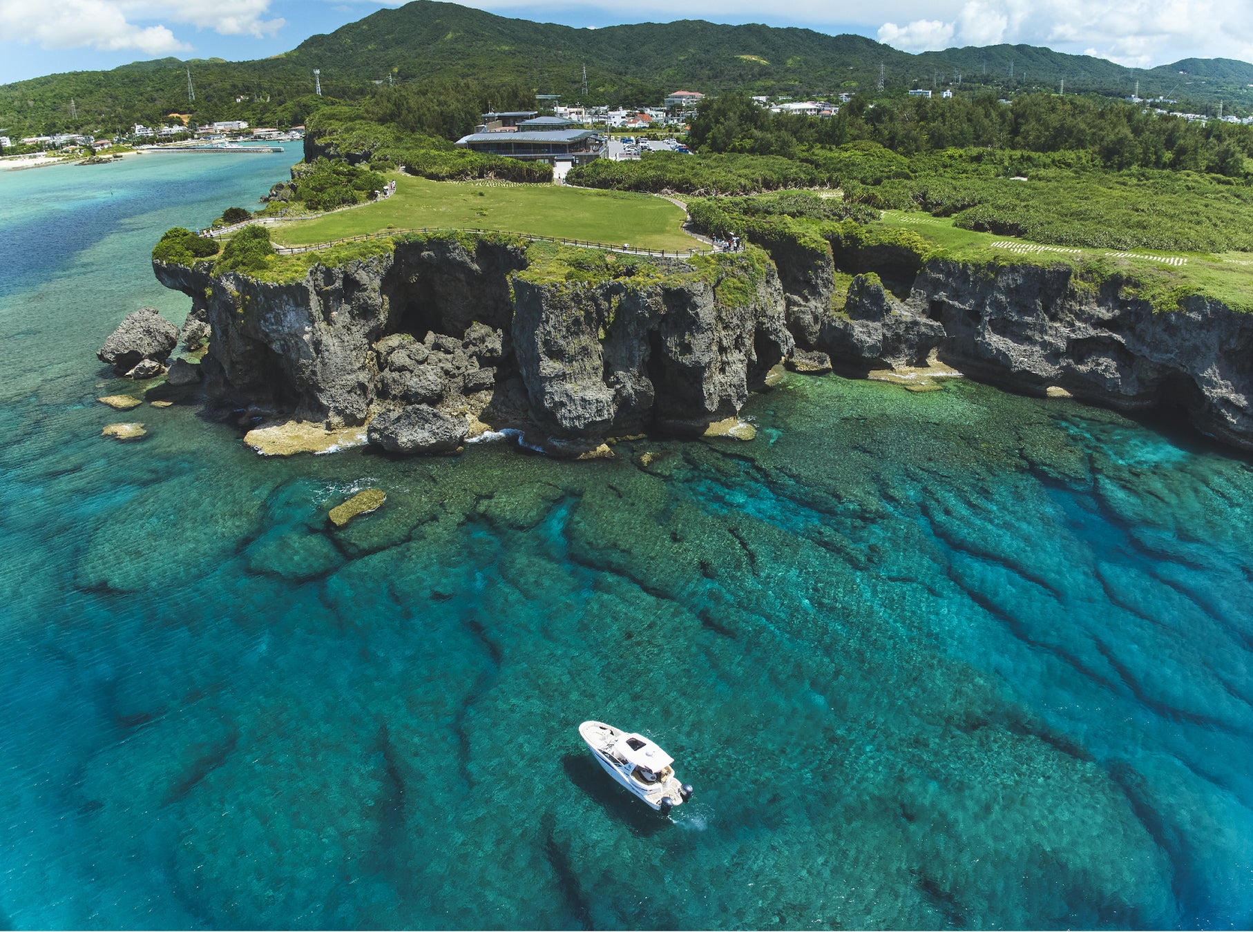 一方、万座毛クルーズでは、沖縄有数の景勝地「万座毛(まんざもう)」を海側から望むクルーズをご用意しました。ダイナミックな断崖と東シナ海の美しいグラデーションが織りなす景色は、陸上からとはまた違った角度でその迫力を感じていただけます。自然と一体になるような静かな時間の中で、沖縄の雄大な風景を船上からゆったりとご堪能いただけます。