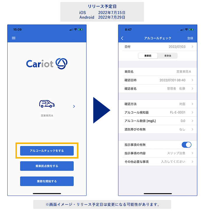 株式会社フレクト(本社:東京都港区、代表取締役CEO:黒川 幸治、以下フレクト)がサービス展開するクルマと企業をつなぐドライバー働き方改革クラウド「Cariot(キャリオット、以下Cariot)」は、2022年10月からの改正道路交通法施行に伴うアルコール検知器使用の義務化に対応し、2022年4月にリリースした「アルコールチェク結果管理」機能をアップデートし、スマートフォンからの入力にも対応しました(今回のリリースはiOSのみ。Androidは2022年7月29日対応予定)。