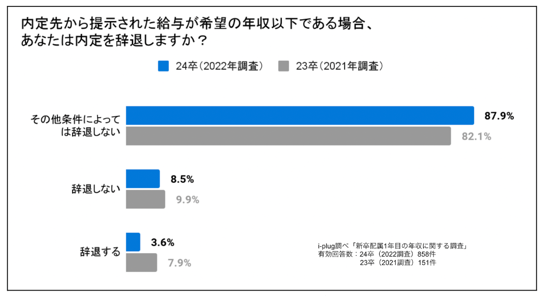 - 内定先から提示された給与が希望の年収以下である場合、あなたは内定を辞退しますか?(単一回答)