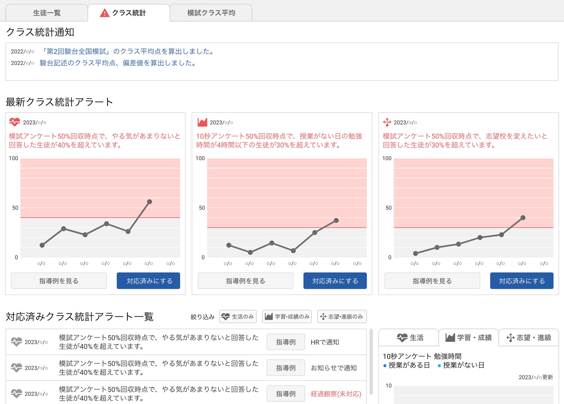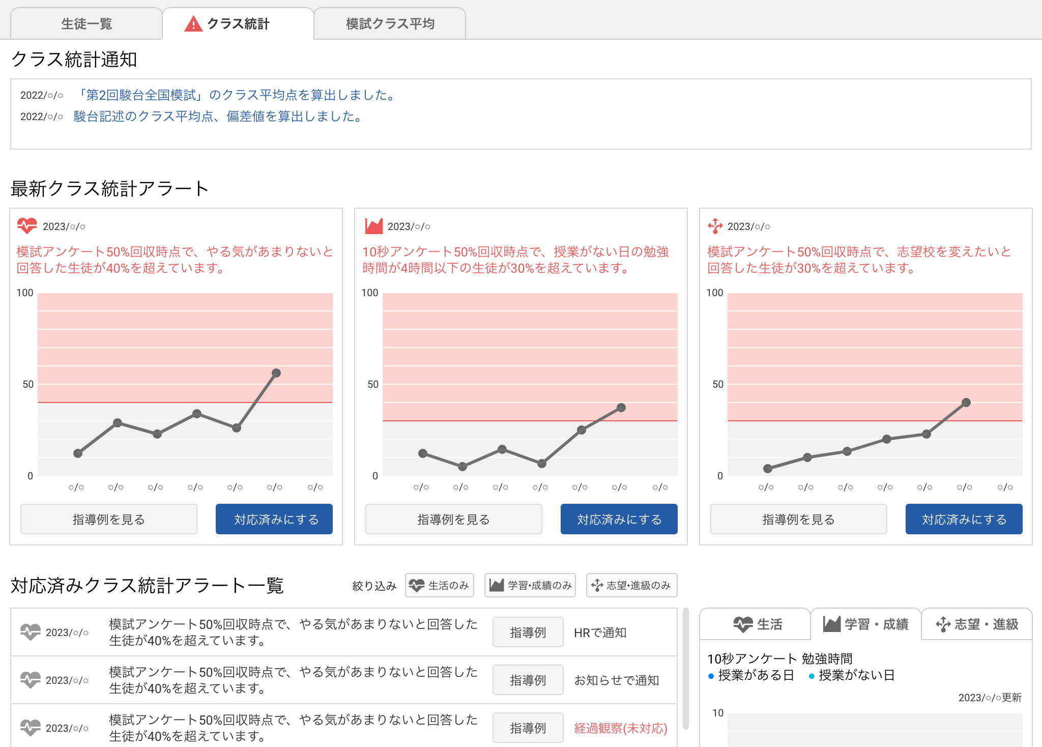 模試成績やアンケート結果のクラス平均データを表示する機能です。「10秒アンケートによると『平日の勉強時間』のクラス平均は8.56時間です(前回7.82時間)」といったクラスの平均データが表示されるほか、「模試アンケートの回答によると、5割回収時点で『力を発揮できなかった』と感じている生徒が半数を超えています」など、指導が必要な際にはアラートを表示し、その際の適切なクラス指導方法例を表示します。クラス担任は、表示された指導方法例をもとに、ホームルームの場や個別指導を通じて改善を促します。また、その対応内容もデータが蓄積され、効果のあった対応内容を分析、共有するなど、改善活動に利用する予定です。