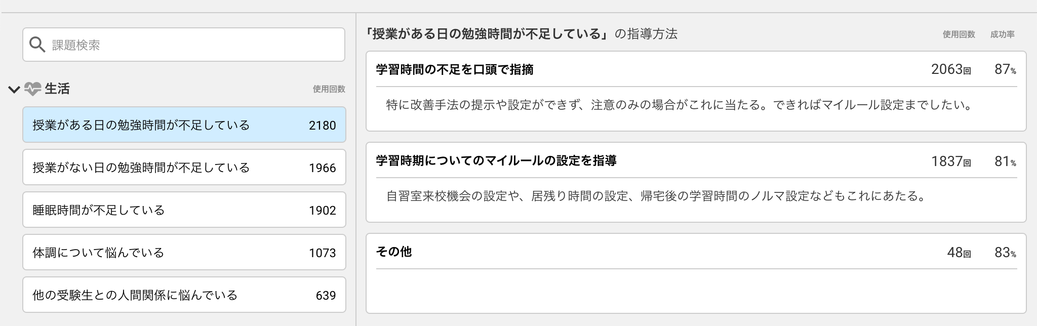 模試や生徒アンケートなどで、指導が必要な際の対応方法を一覧で確認できるとともに、各指導例の全国での使用回数と成功率も表示し、クラス担任の経験の差によらず、有用な対処方法を実践することで、指導の高度化と標準化を実現します。