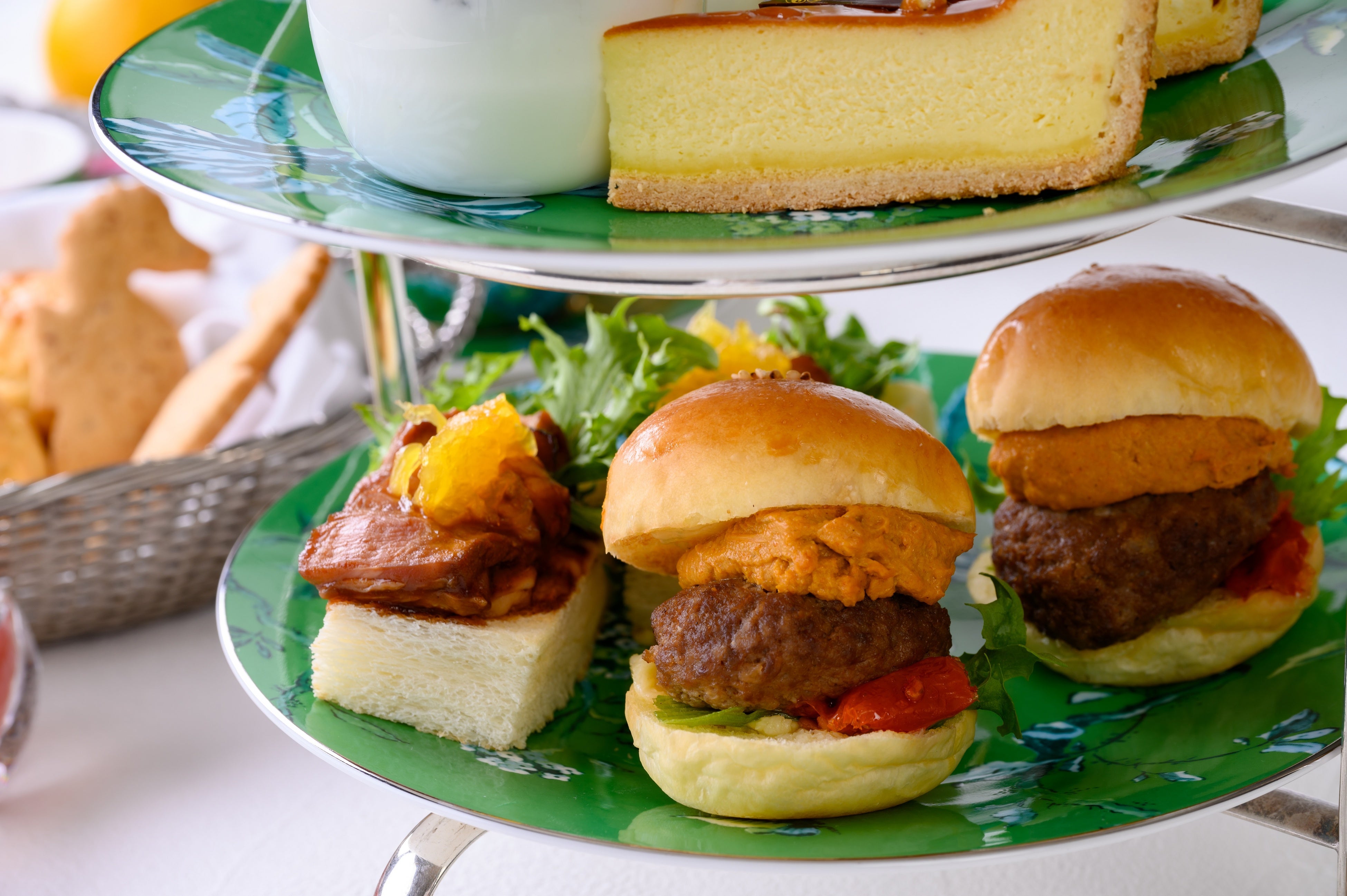 ≪1段目≫ 三重県産美熊野牛と桃のミニバーガー/桃のフルーツサンド