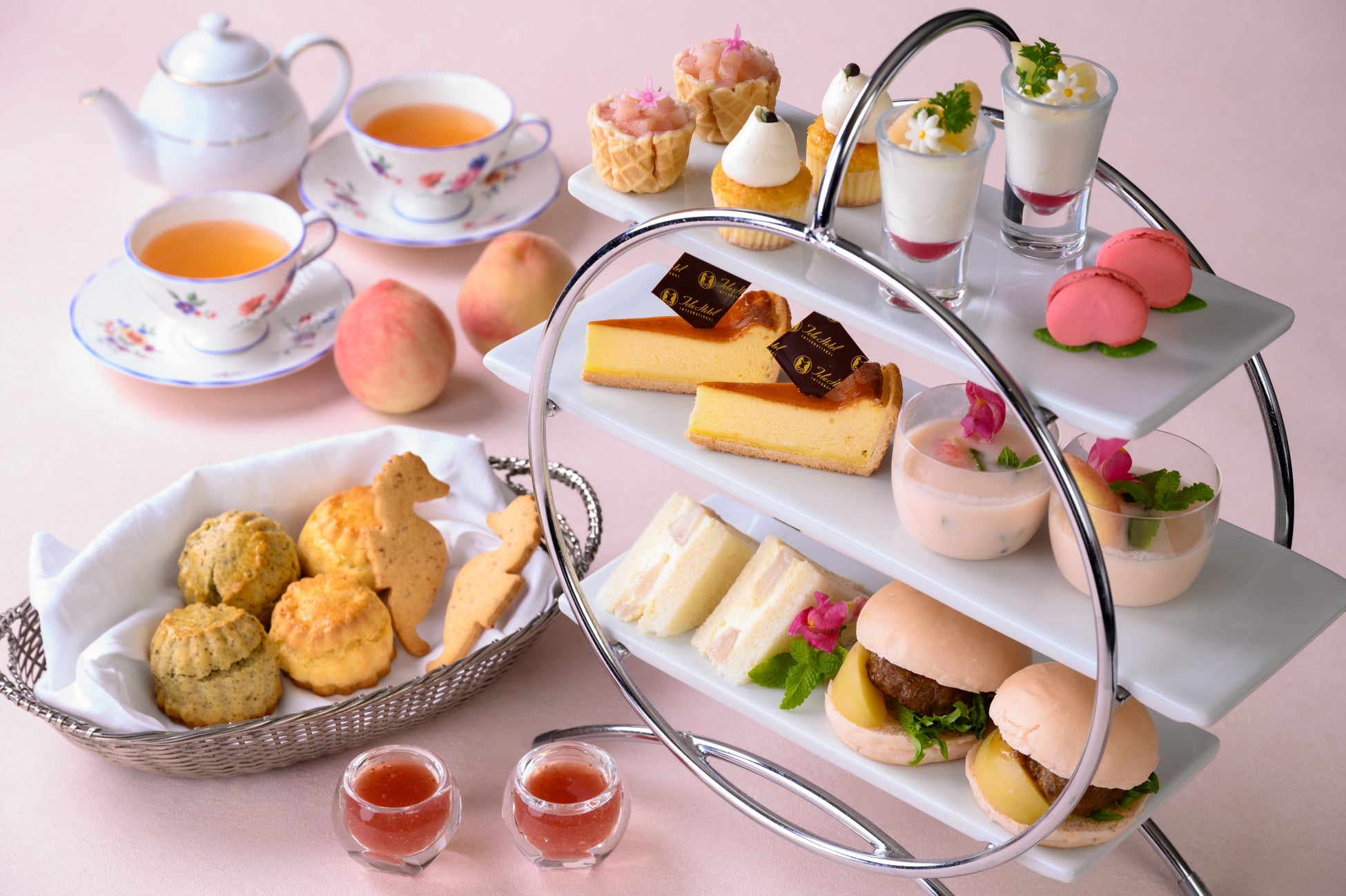 優しい甘さの桃を、 タルトやマカロン、フルーツサンド、さらにはミニバーガーなどに、ふんだんに使用し仕上げています。また、桃の淡いピンク色が癒しとなり、ゆったりとしたアフタヌーンティーのひとときとしてもご堪能いただけます。