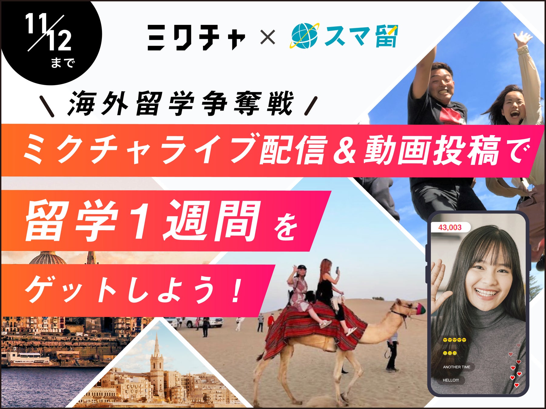 海外留学エージェント『スマ留』、ライブ配信&動画アプリ『ミクチャ』と協業し、配信イベントを実施開始!優勝者には”海外留学1週間”を贈呈。