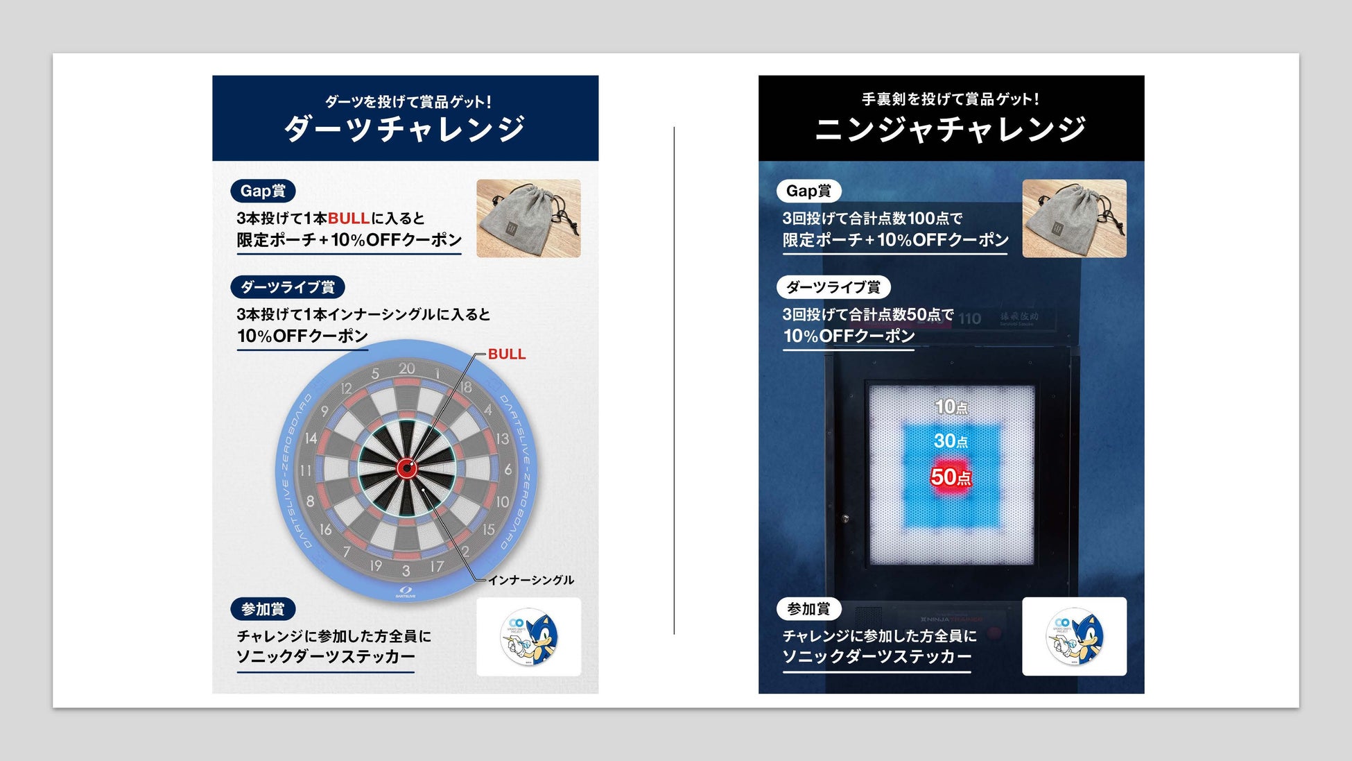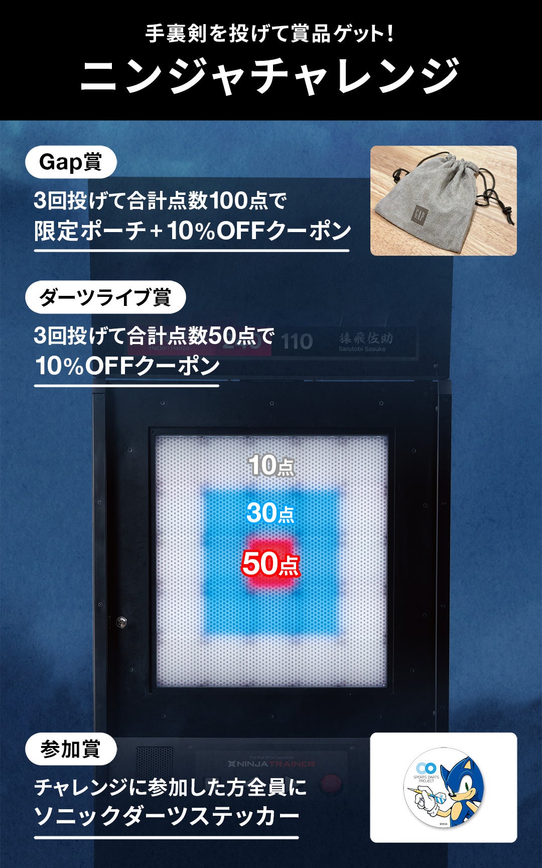 今回のコラボレーションでは、Gapフラッグシップ銀座にダーツマシン「ダーツライブ3」がディスプレイ。店内には、ダーツライブが提供している家庭用ダーツボード「ダーツライブゼロボード」2台と、"最高の忍者体験の提供” をコンセプトに作られた手裏剣を投げるアーケードゲーム「ニンジャトレーナーアーケード」1台が設置され、当日のお買い物に使えるクーポン券がもらえるチャレンジイベントが開催されます。