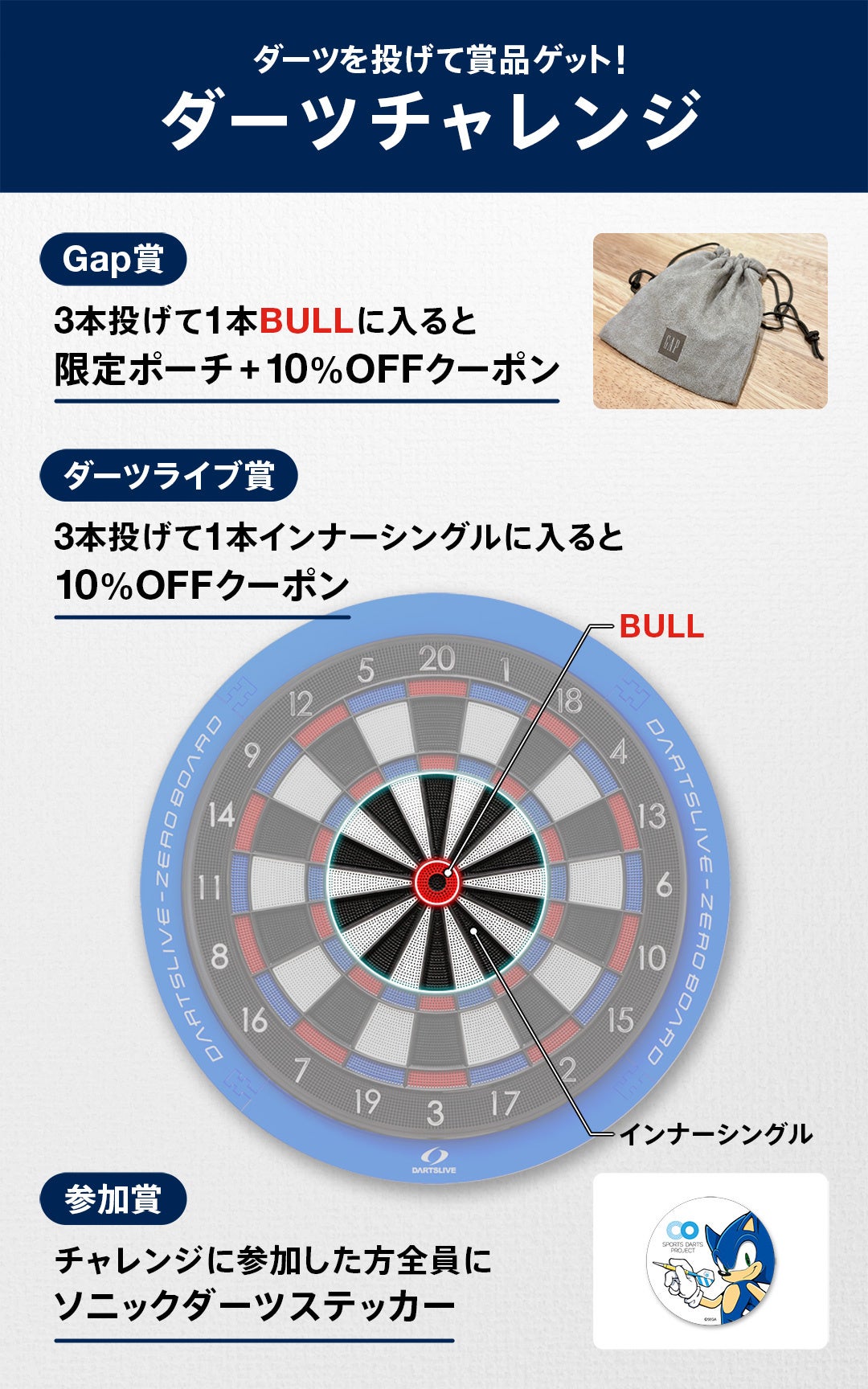 来店者を対象に、ダーツもしくは手裏剣投げのチャレンジイベントを開催。チャレンジを達成すると、Gapフラッグシップ銀座で使用可能な10%割引クーポンやGapオリジナルポーチを、参加者全員にダーツライブオリジナルステッカーをプレゼントします。