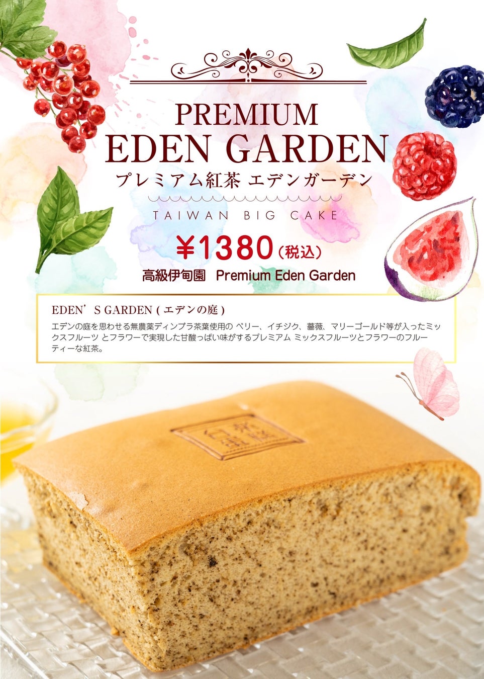 エデンの庭を思わせる無農薬ディンブラ茶葉使用のベリー、イチジク、薔薇、マリーゴールドが入ったミックスフルーツとフラワーで実現した甘酸っぱい味がするプレミアムミックスフルーツとフラワーのフルーティーな紅茶を、プレミアムプレーンカステラの生地にあしらえました。母の日のプレゼントに最適です。